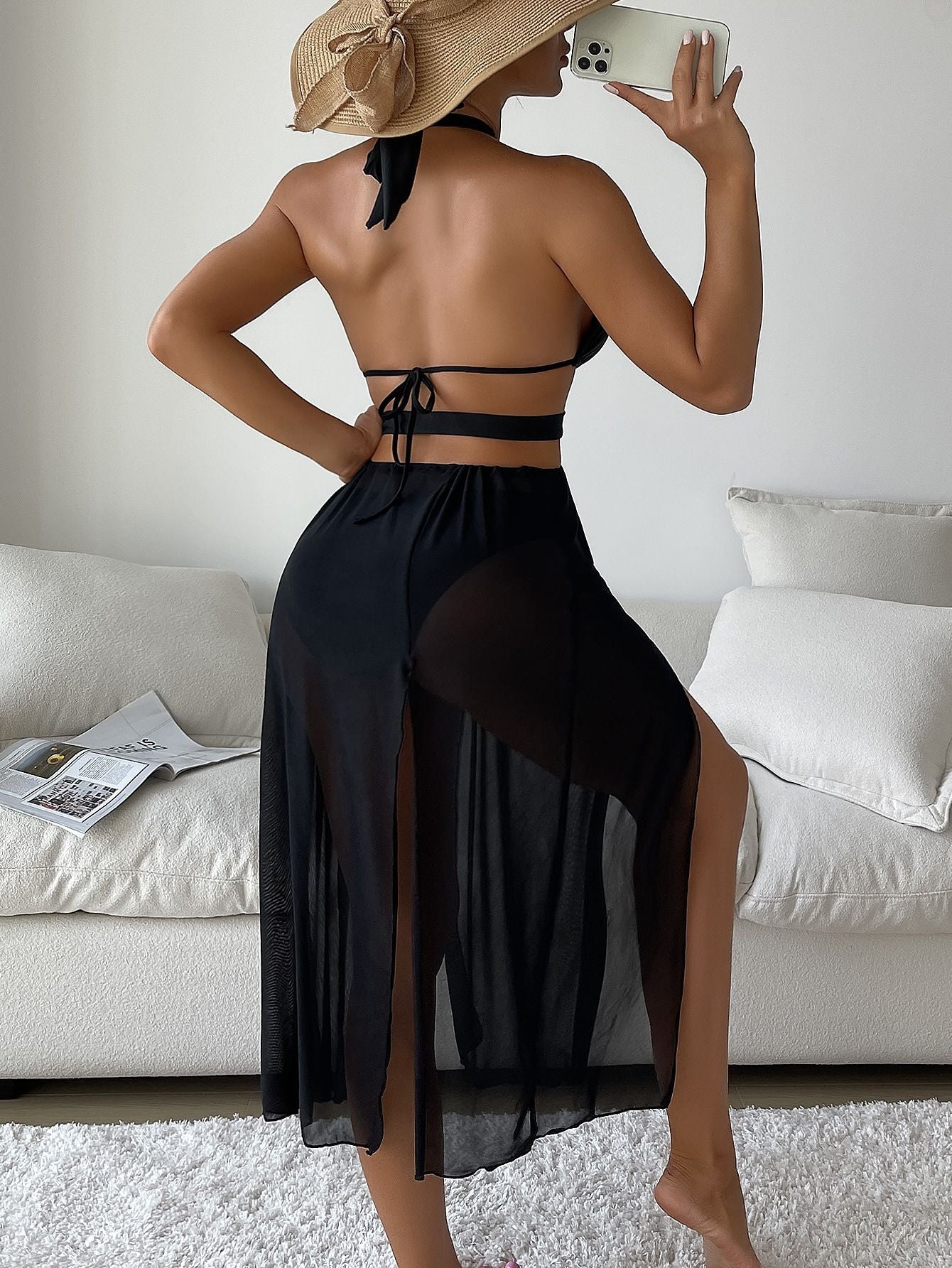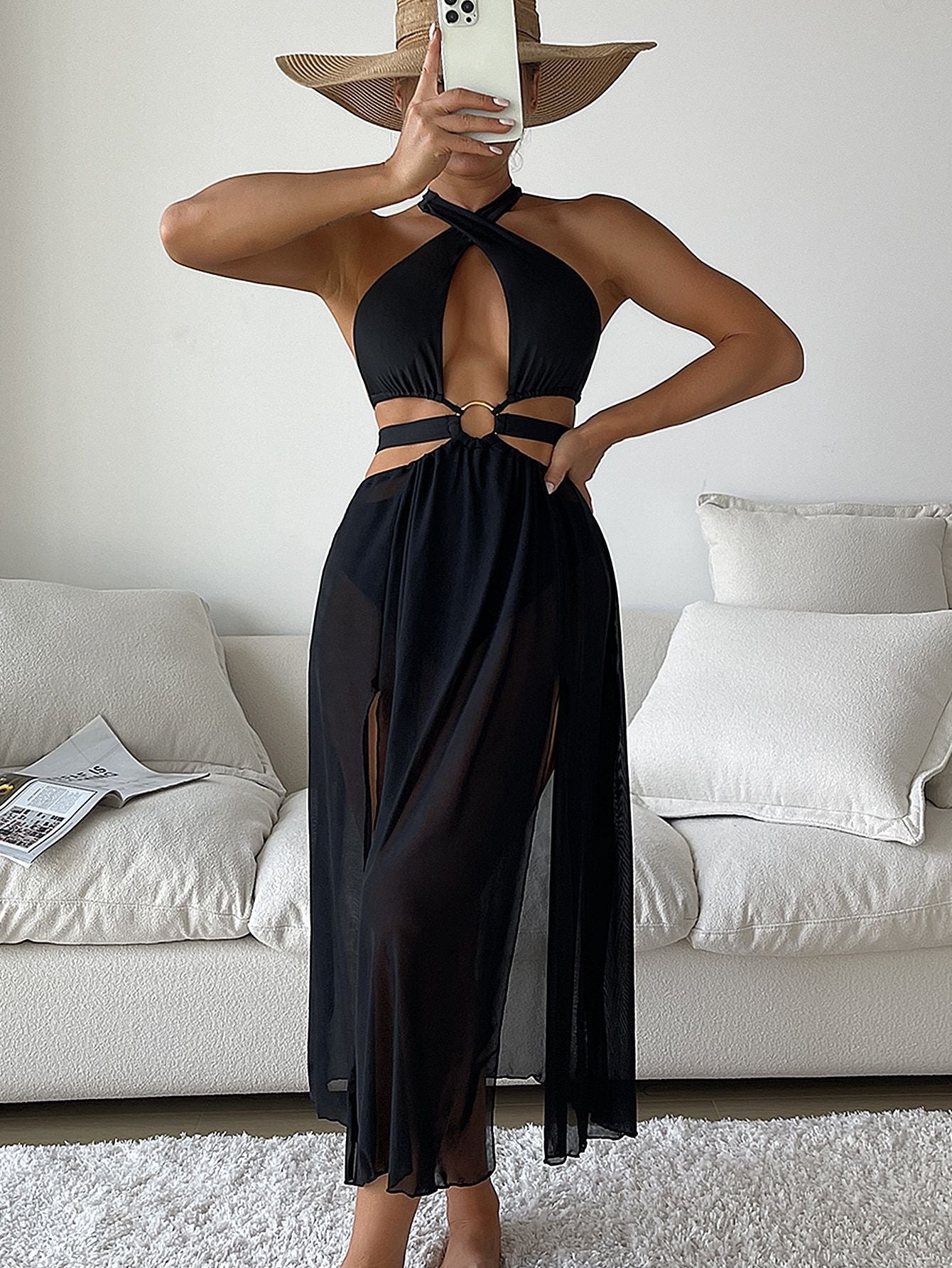 Black Cutout Mesh Maxi Beach Dress | Swimsuit Cover Up with Halter Neck & Side Slits | noémi