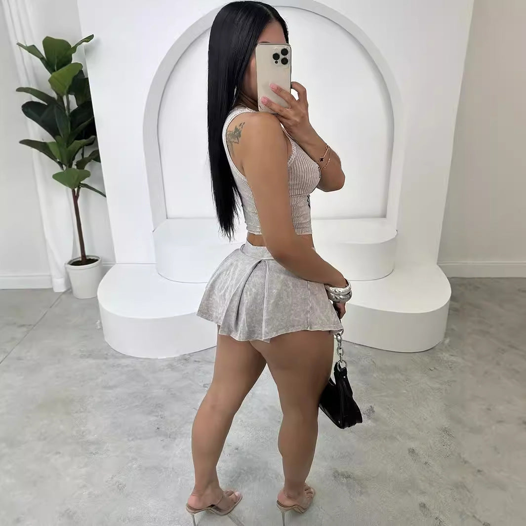 With a tight, body-contouring cropped vest and a flirty pleated skirt that moves with you, it’s giving main character all summer long.