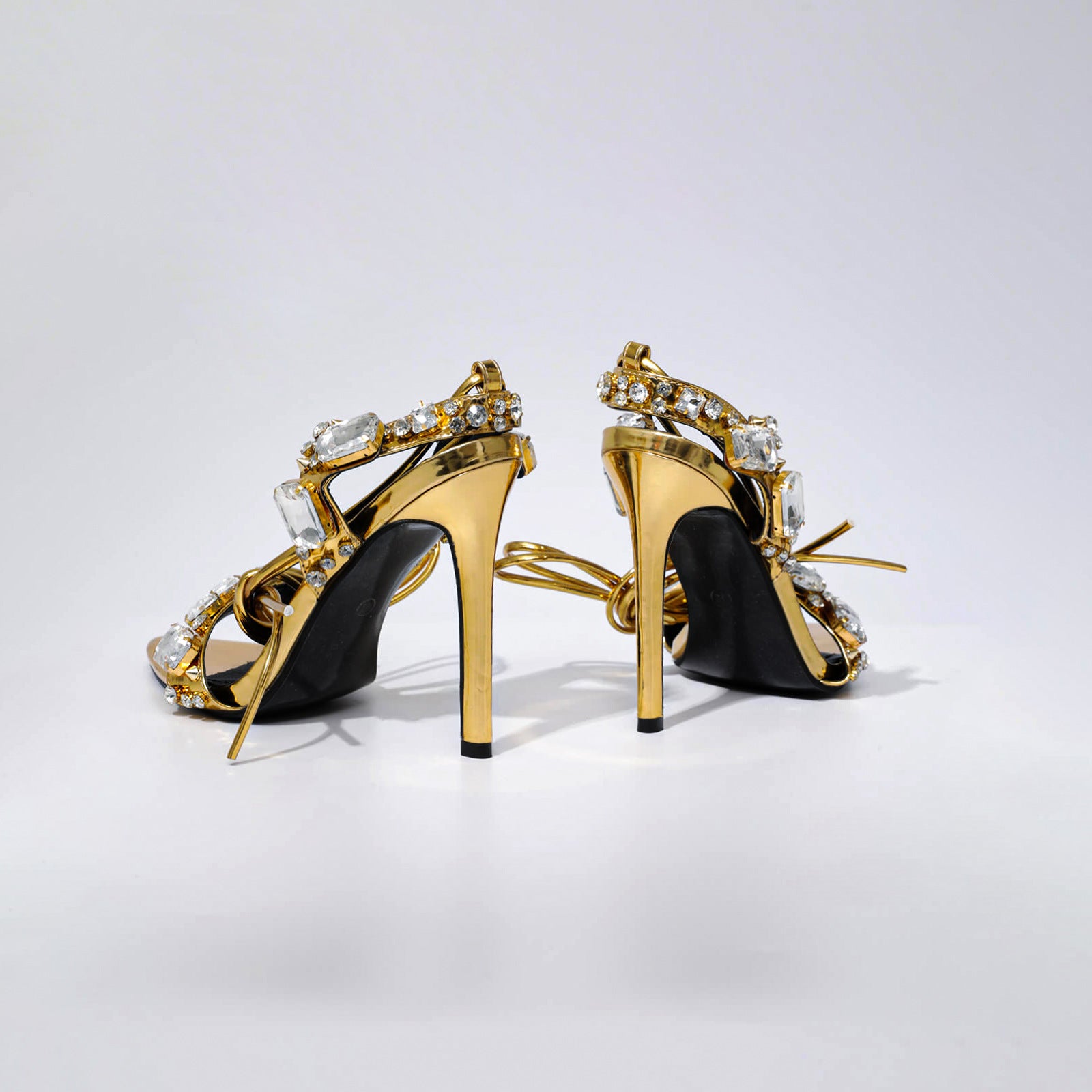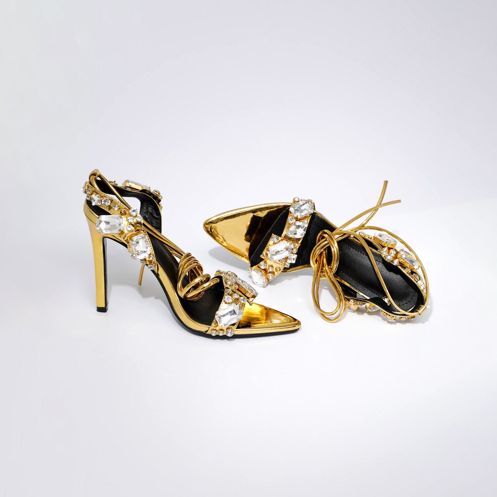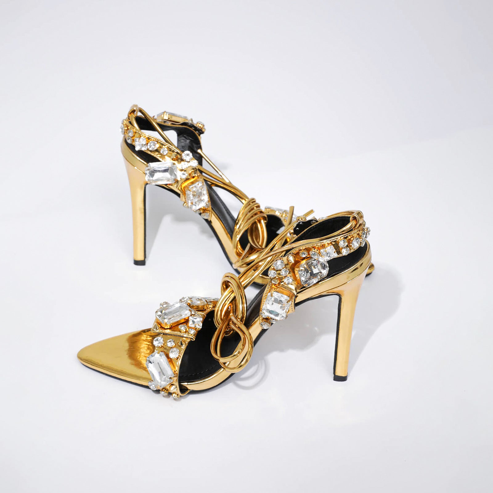 Crystal Embellished Metallic Heels | 11cm Rhinestone Lace Up High Heels | Pointed & Open Toe Sandals | noémi