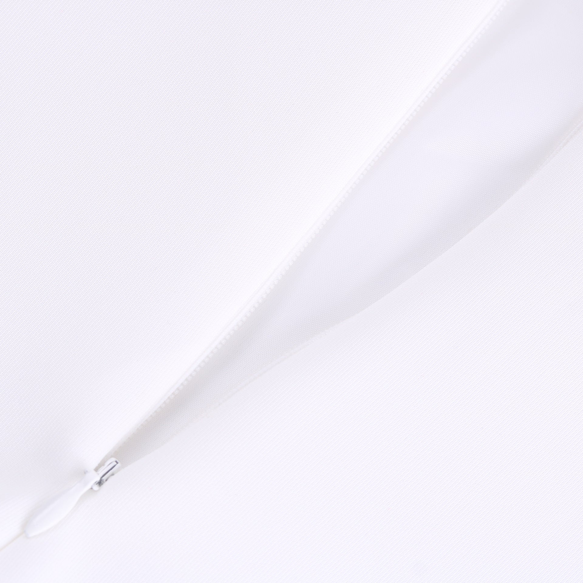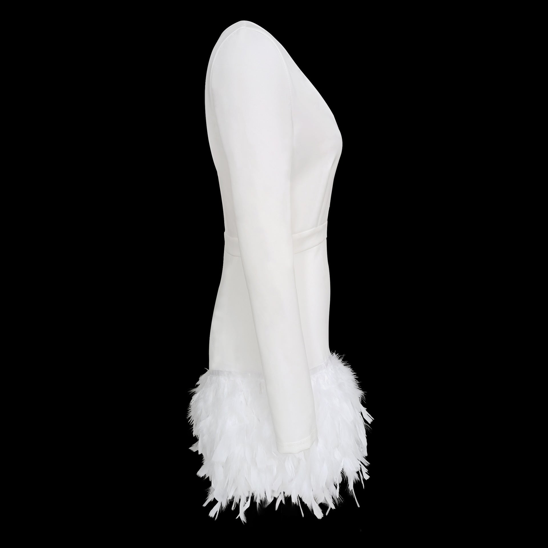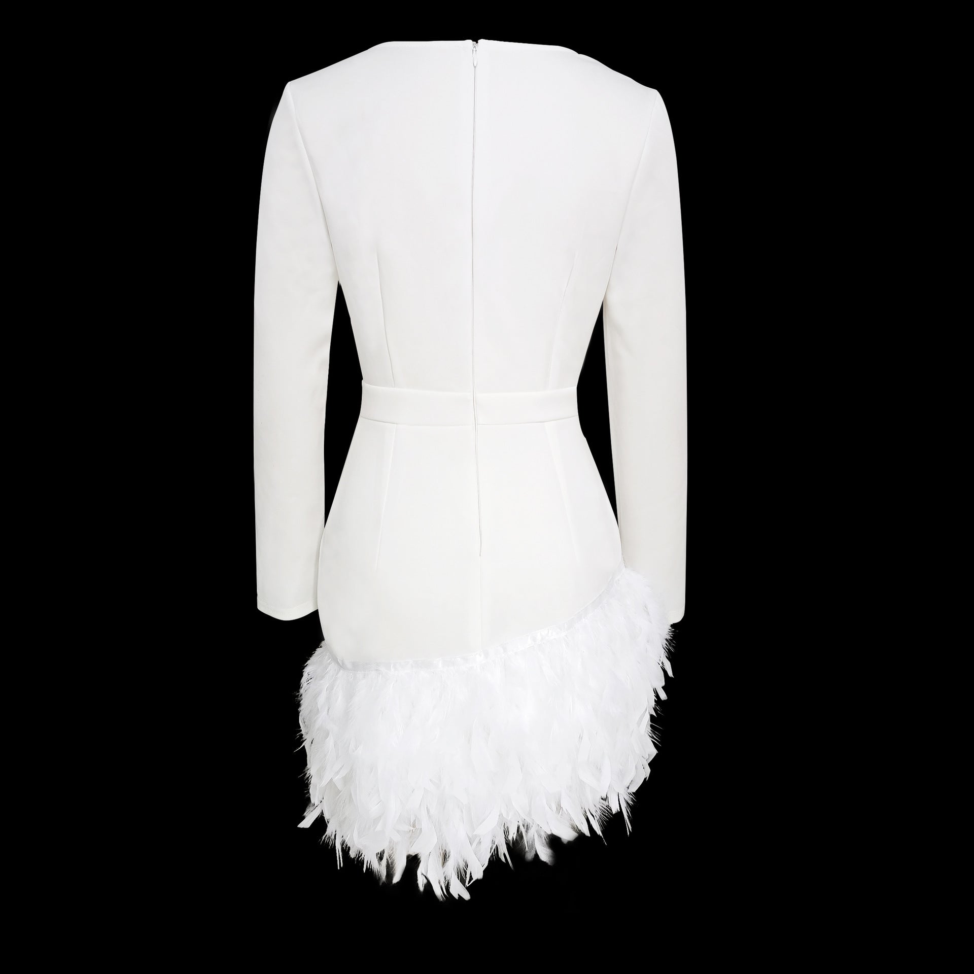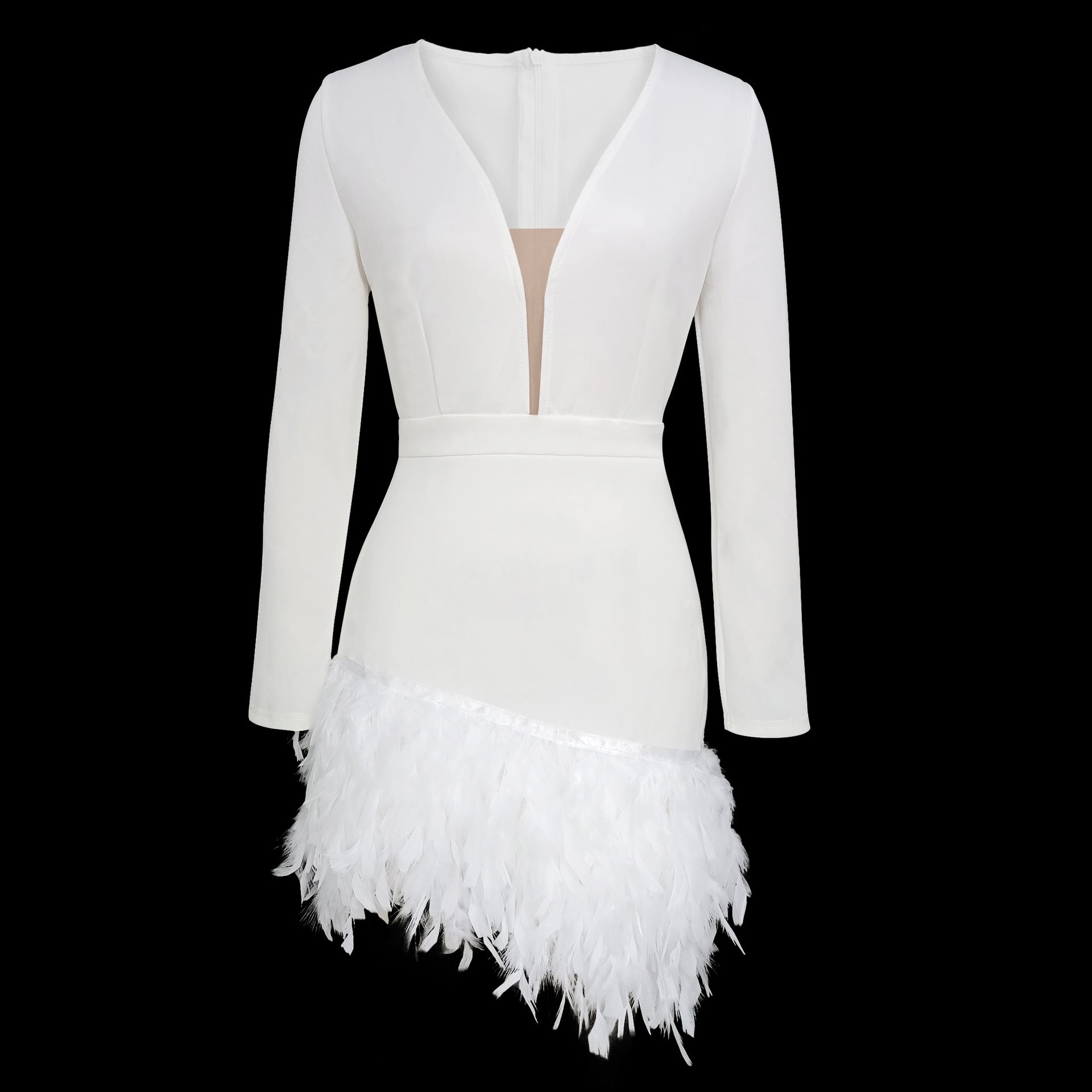 Designed with bold lines and delicate detailing, this sheath dress features a deep V neckline and feather-stitched trim for standout texture.