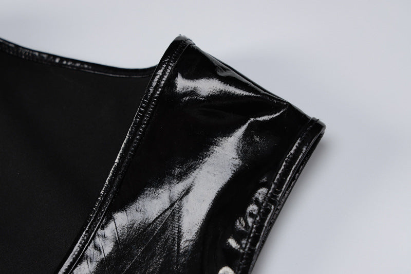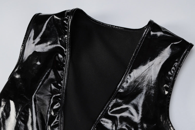 Crafted from luxe faux leather, this sleeveless, body-hugging dress features a daring deep plunge neckline that commands attention.