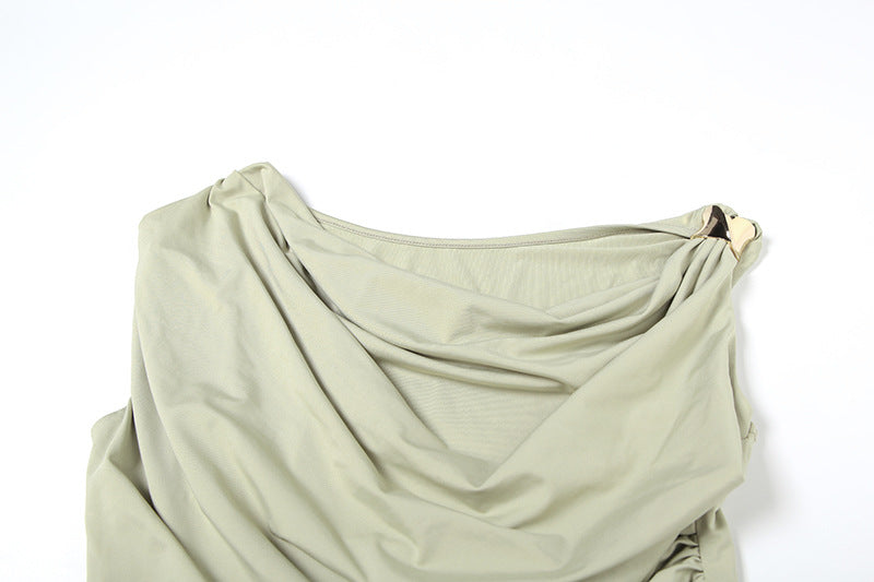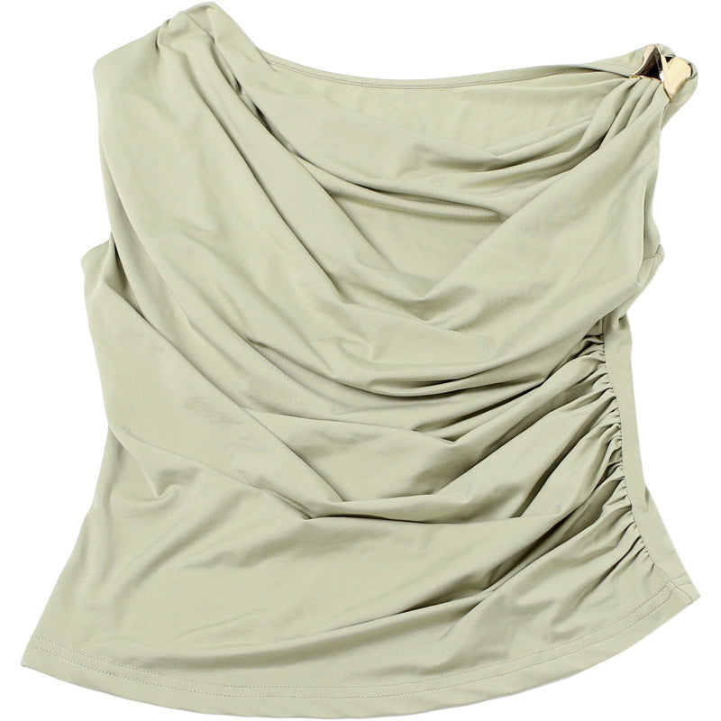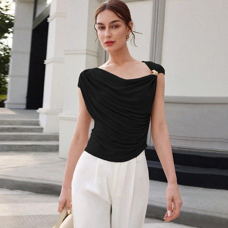 The Diagonal Drape Sleeveless Top is the perfect blend of soft sophistication and modern design. Featuring a stunning asymmetrical neckline with luxe draping and a subtle gold-tone pin detail, this top adds instant polish to any look — without even trying.