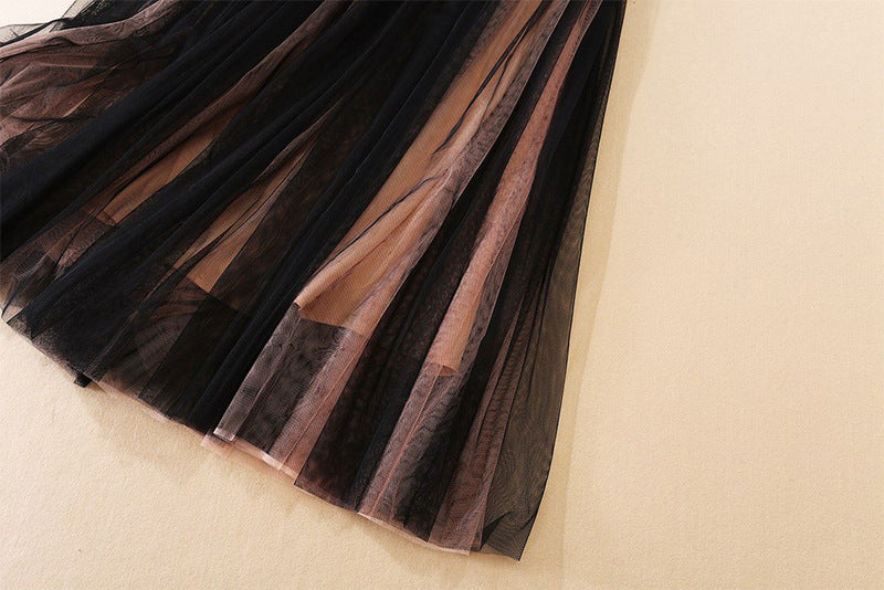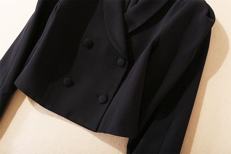 This double-breasted green collar top paired with a multi-layer mesh pleated skirt brings effortless grace to your spring and autumn looks.