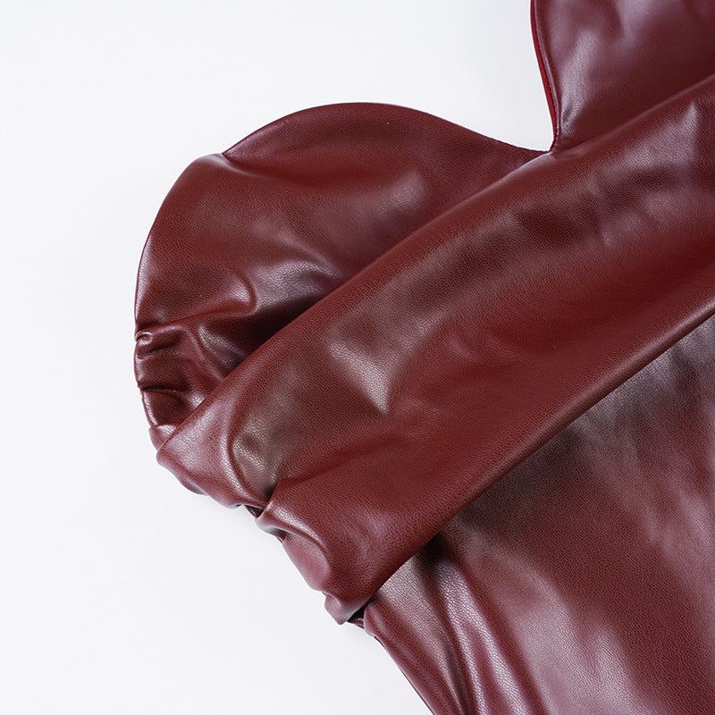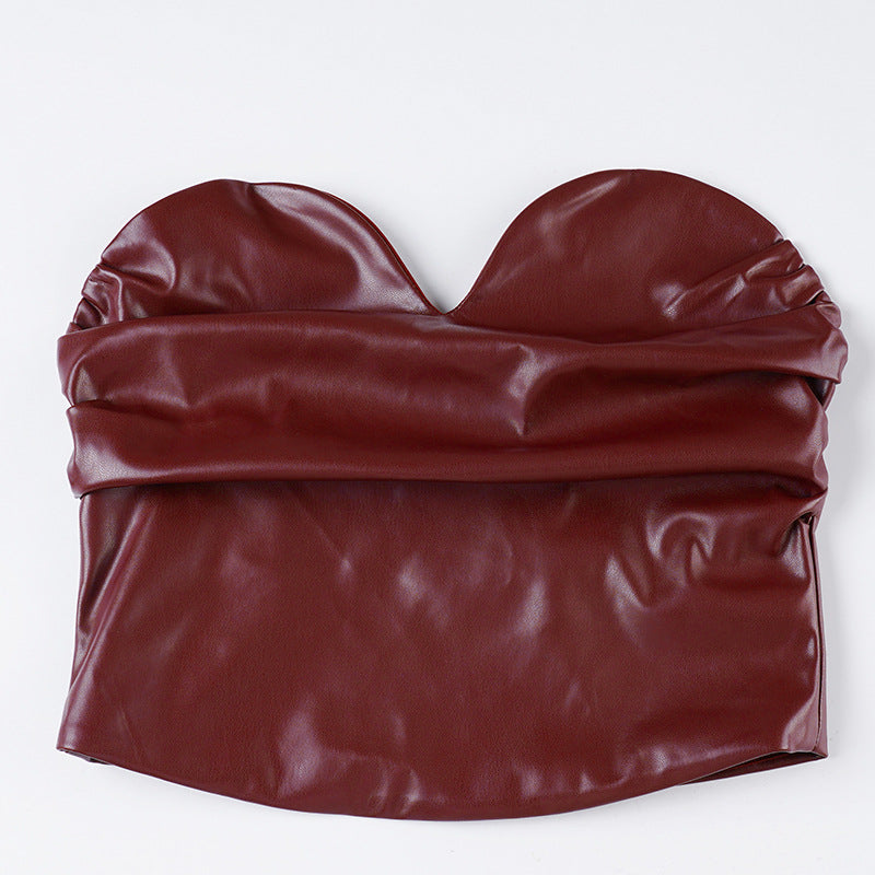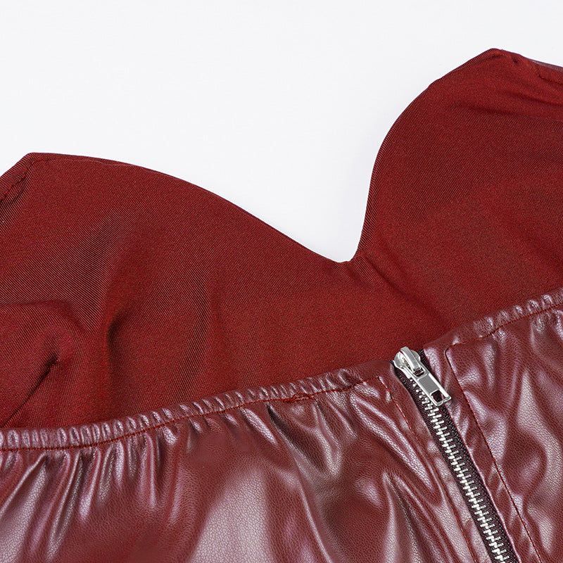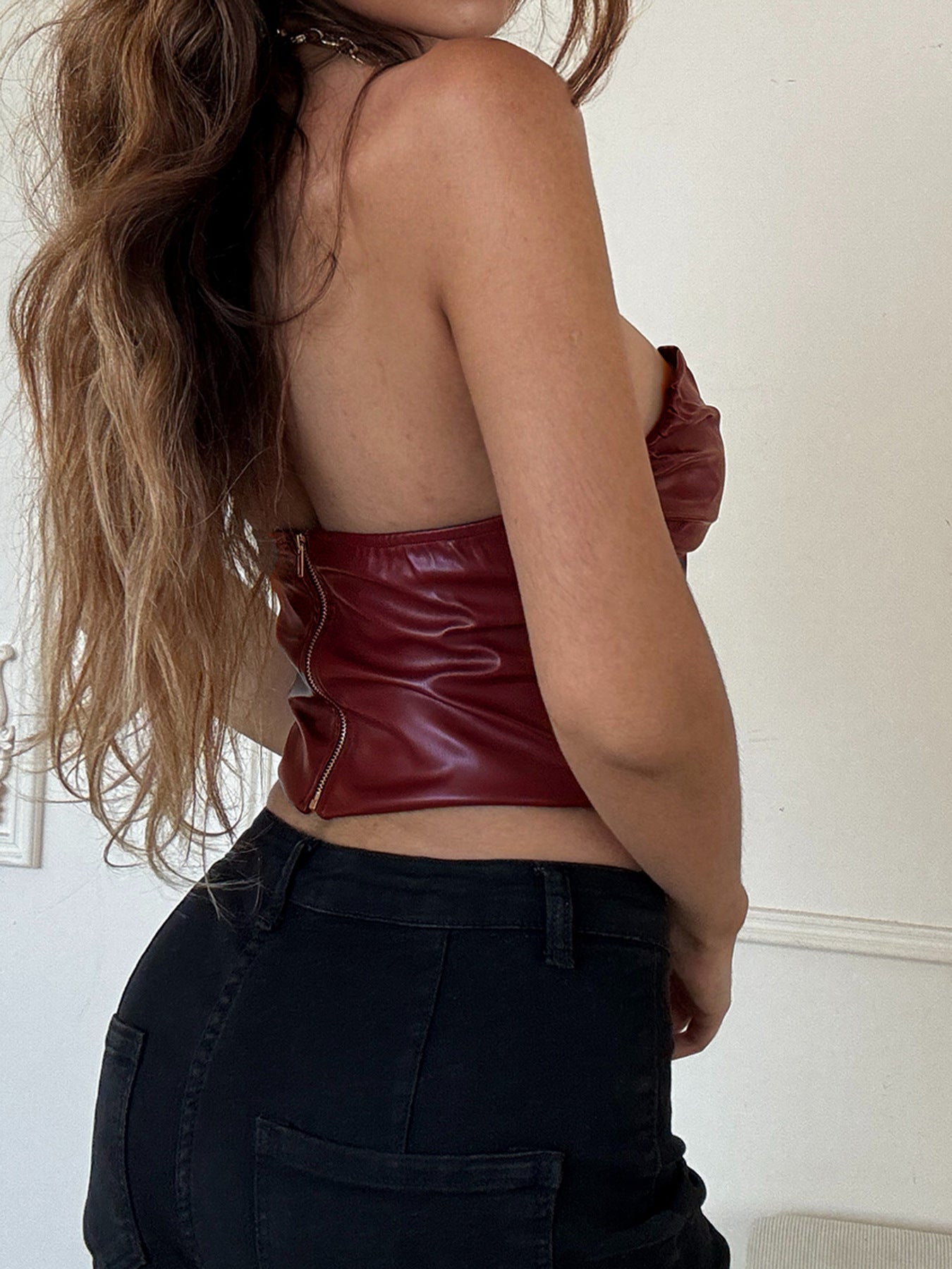 Faux Leather Bandeau Top | Asymmetric VNeck, Pleated Waist, Strapless, Wine Red | noémi