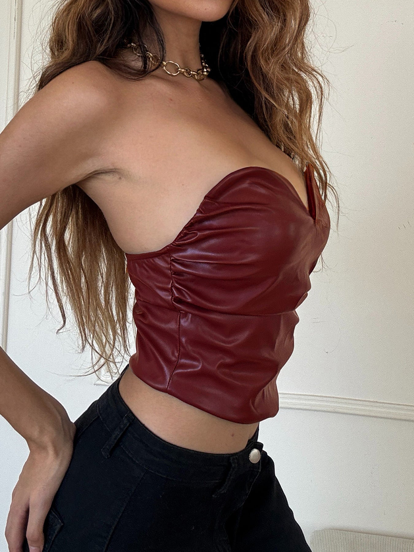 This Wine Red Faux Leather Bandeau Top is not for the shy. With its ultra flattering Vneckline and sculpted pleated waist, this piece is made to steal the spotlight. The luxe faux leather hugs you in all the right places while the strapless, cropped cut gives just the right amount of edge.