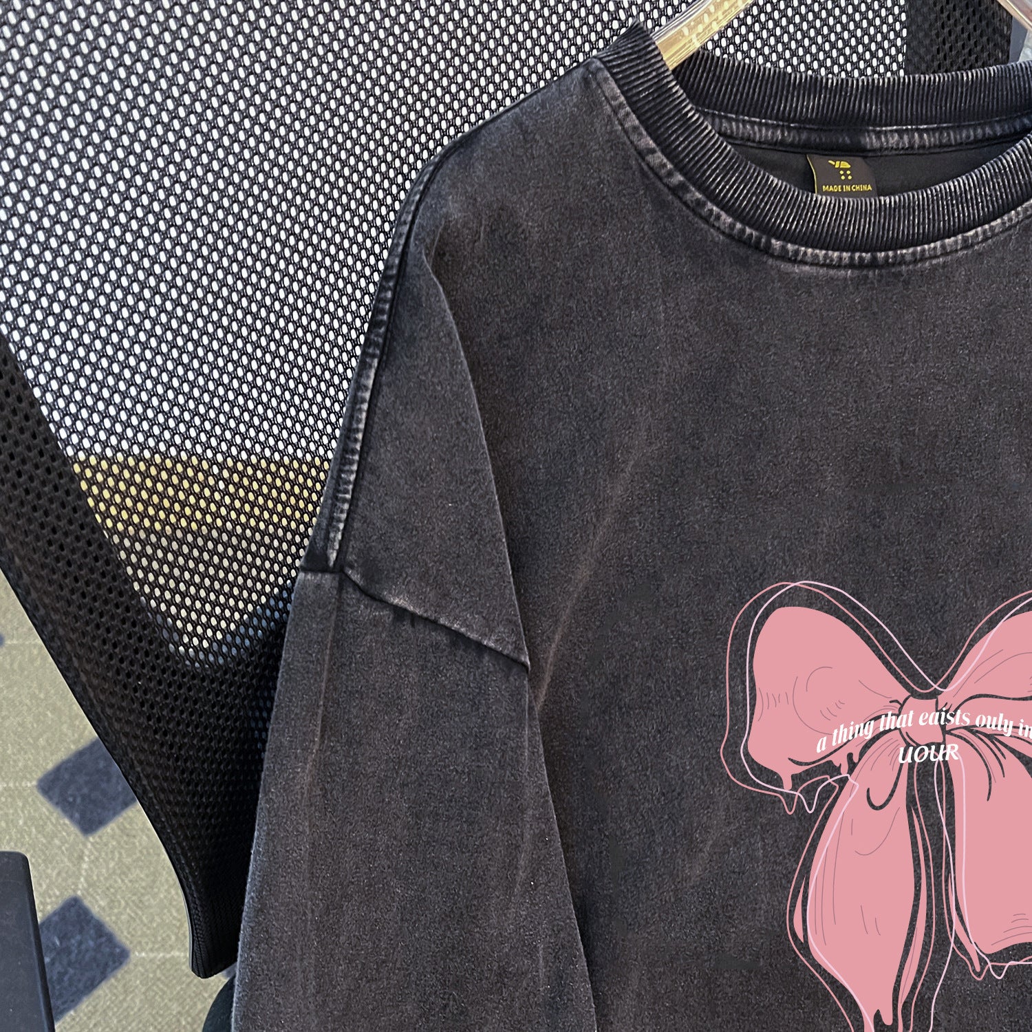 Cozy, cute, and totally on-trend — this washed black pullover is the ultimate fall-winter staple. Featuring a bold pink bow graphic, an oversized fit, and soft fleece lining for extra warmth, it's made for days when comfort and style are non-negotiable.