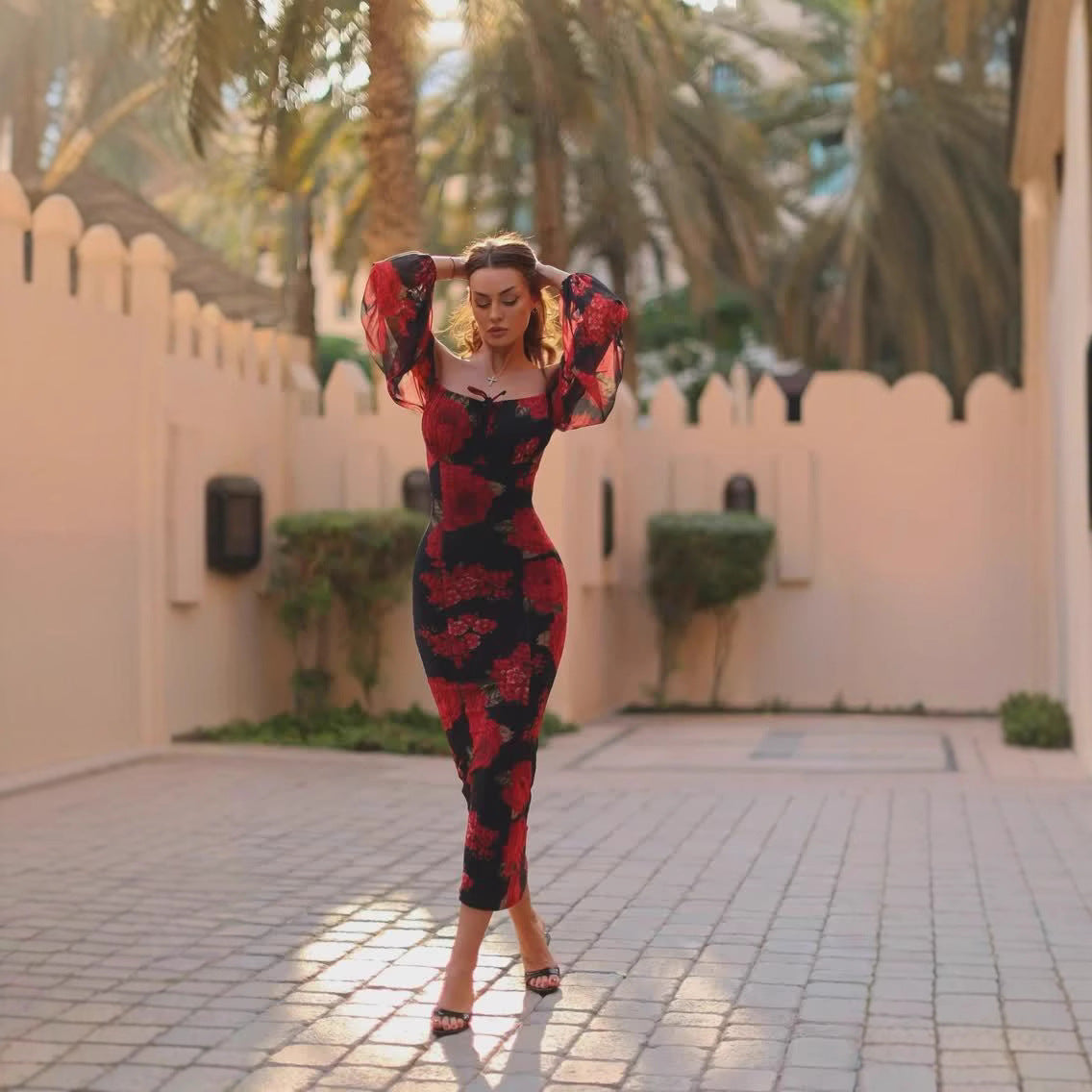 Floral Off Shoulder Slim Fit Dress With Tea Length Hem | noémi