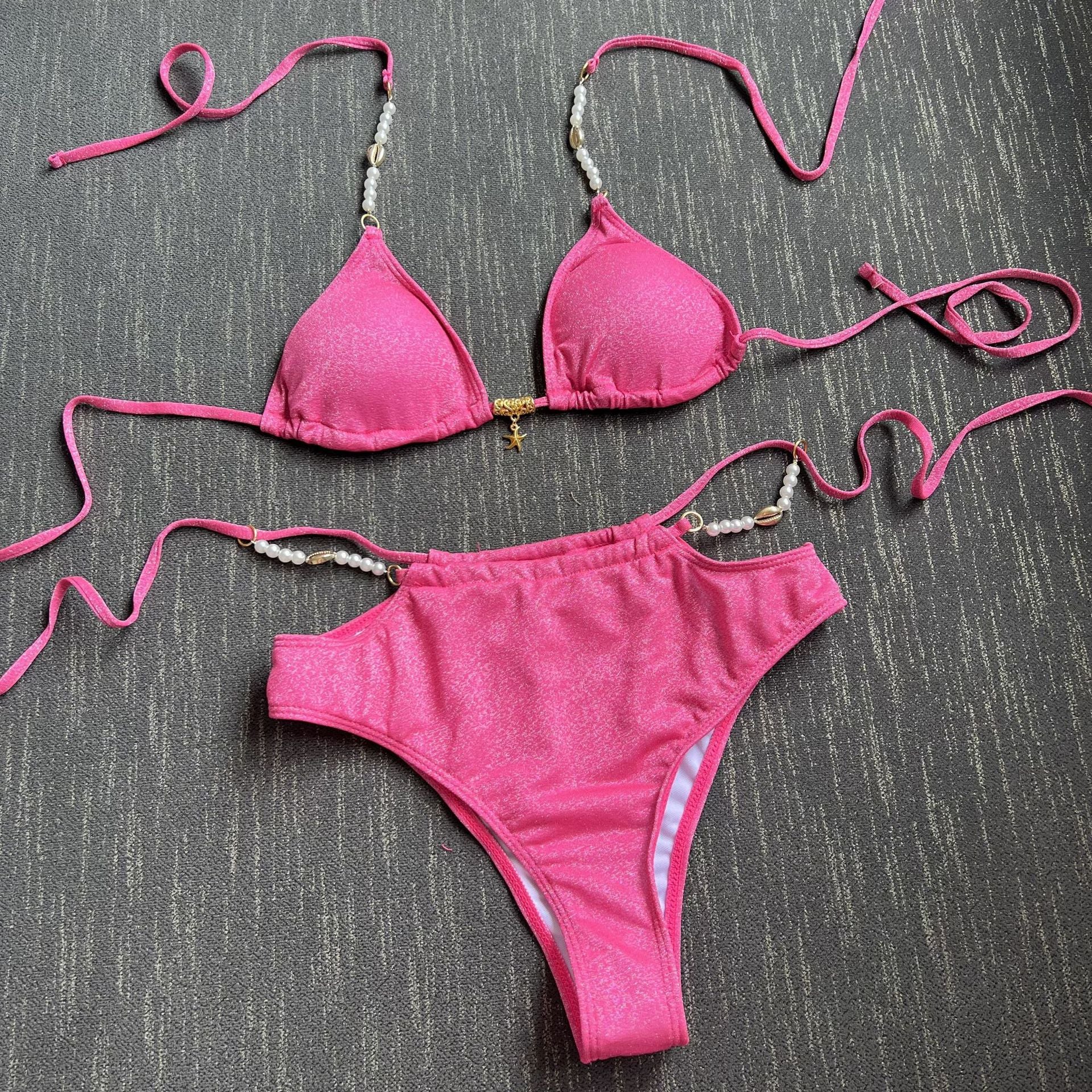 Ready to turn heads and steal the spotlight? Meet the High Waist Pearl Chain Bikini your new must-have for glam getaways and sun-drenched escapes.This shimmering hot pink set isn’t just a swimsuit it’s a statement. With a flattering high-waist cut and luxe pearl chain details on both the top and bottom, you’ll feel confident, sexy, and effortlessly elevated.The halter-style triangle top enhances your shape, while the side cut-out adds just the right amount of edge.