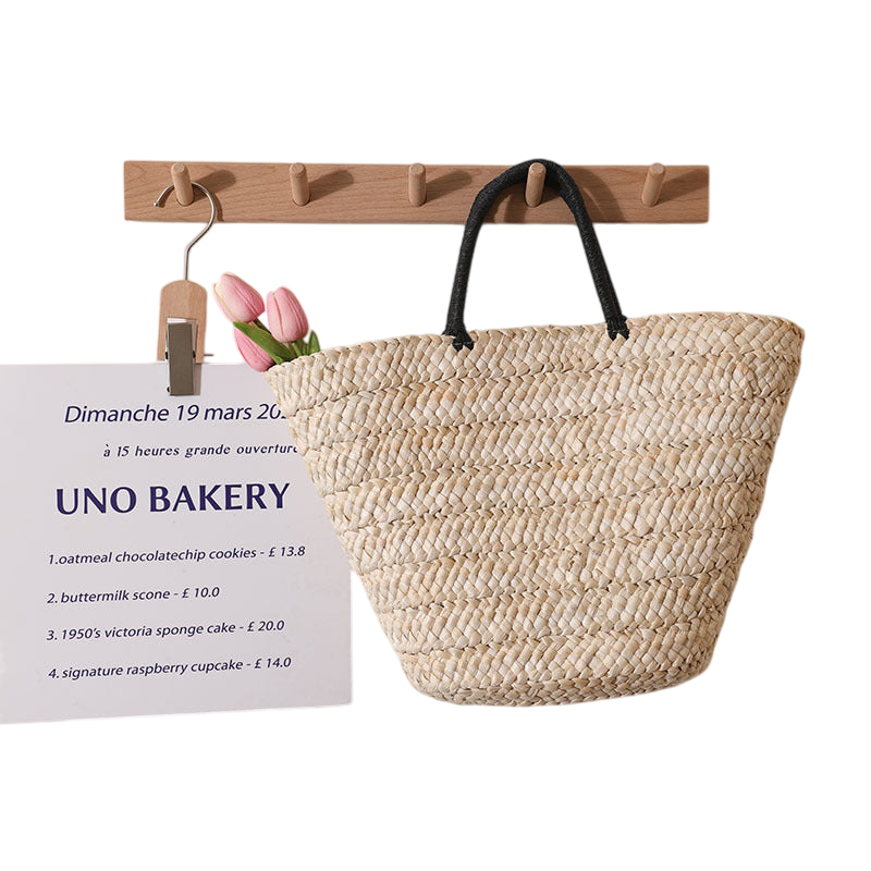Roomy hand-woven straw tote keeps towels, sunscreen and market finds breezy and sand-free.