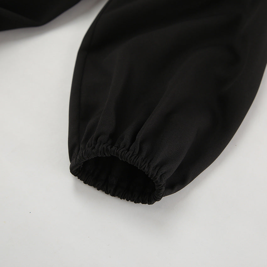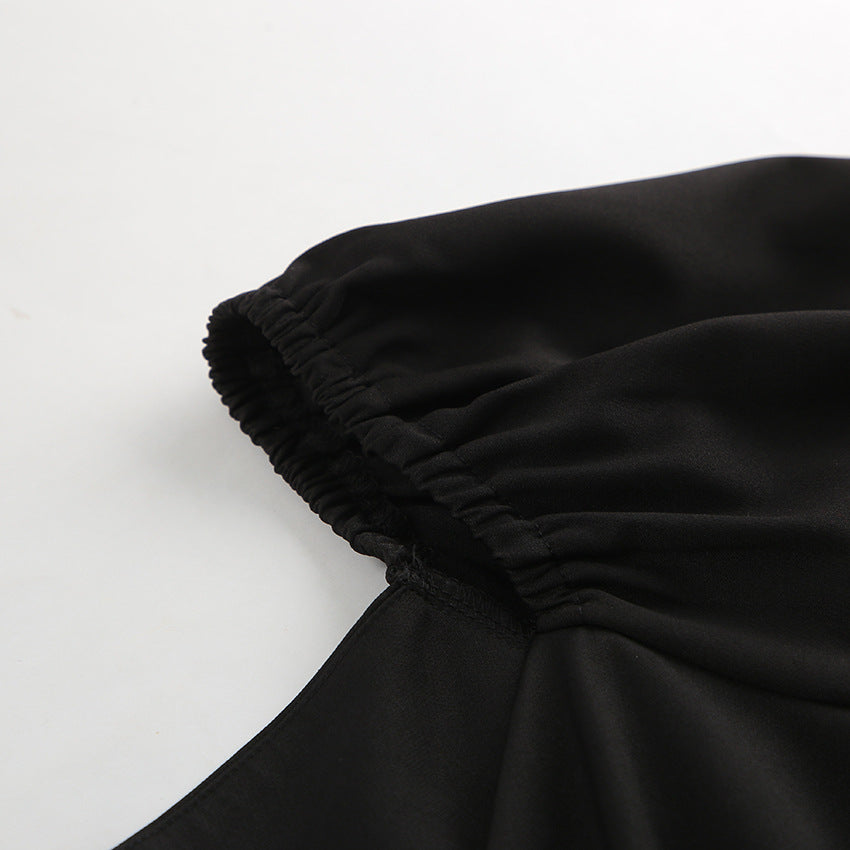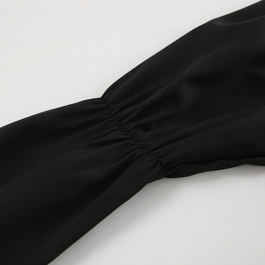 This slim fit black dress features a deep V neckline, long sleeves, and a pleated waist that softly defines your silhouette.