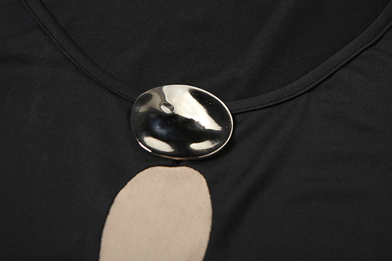 A sleek sheath dress combining mesh patchwork and a flattering v neck for a contemporary, refined silhouette.