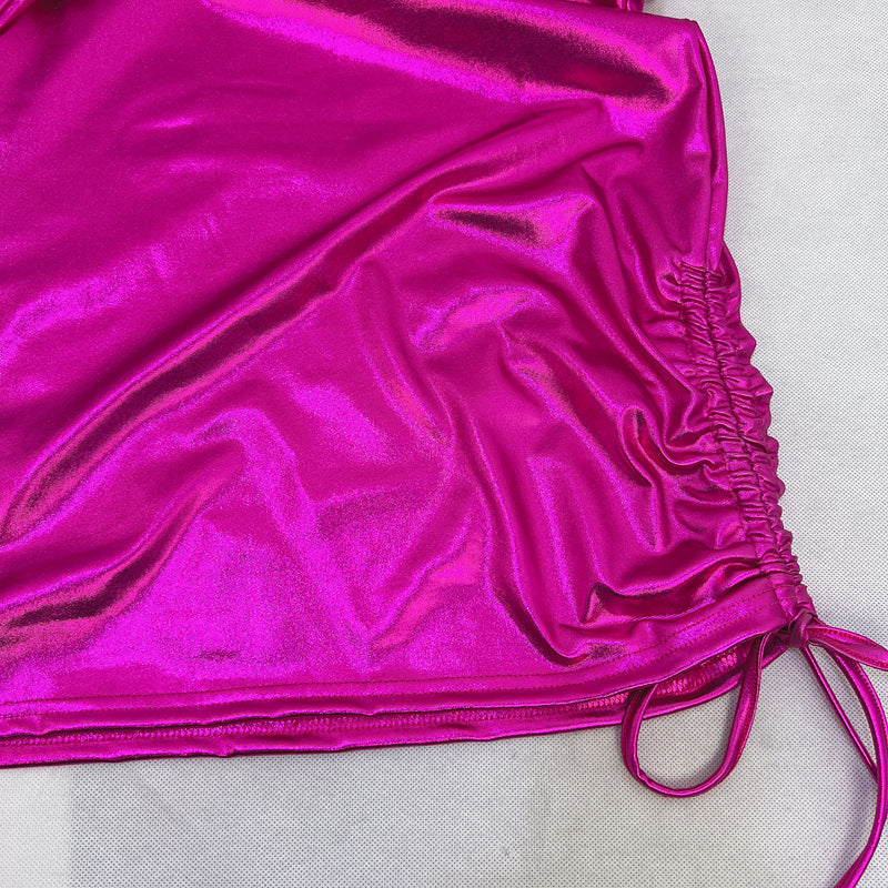 This daring dress features a shimmering metallic finish, a flattering asymmetrical shoulder cut, and a trendy drawstring waist that cinches your silhouette perfectly.
