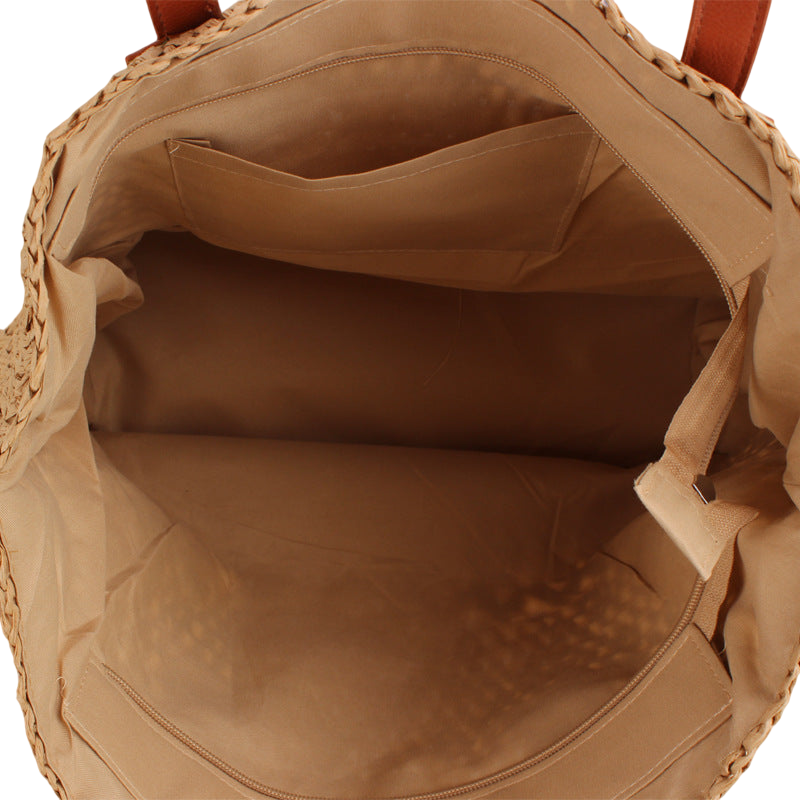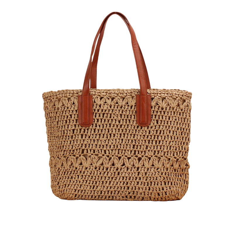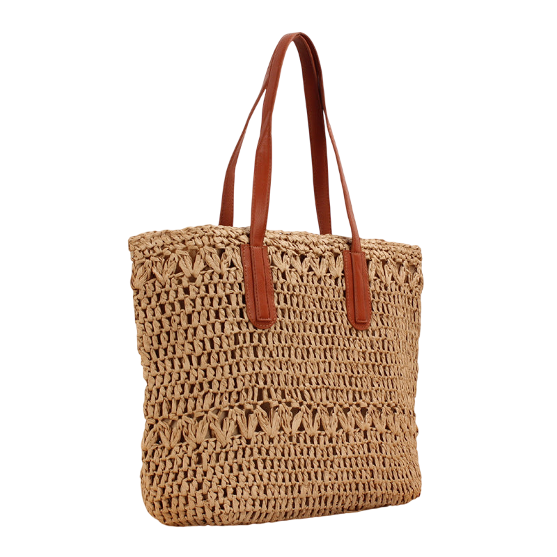 Hollow‑out woven straw shoulder bag in natural tone—perfect for beach days and casual summer outings, light and breathable with artisanal flair.