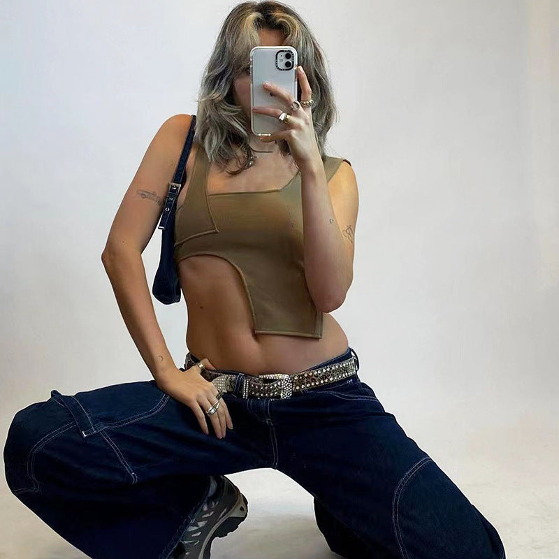 Add an edge to your look with this slim fit asymmetric vest, crafted with bold patchwork details and structured shoulder straps for a standout silhouette.