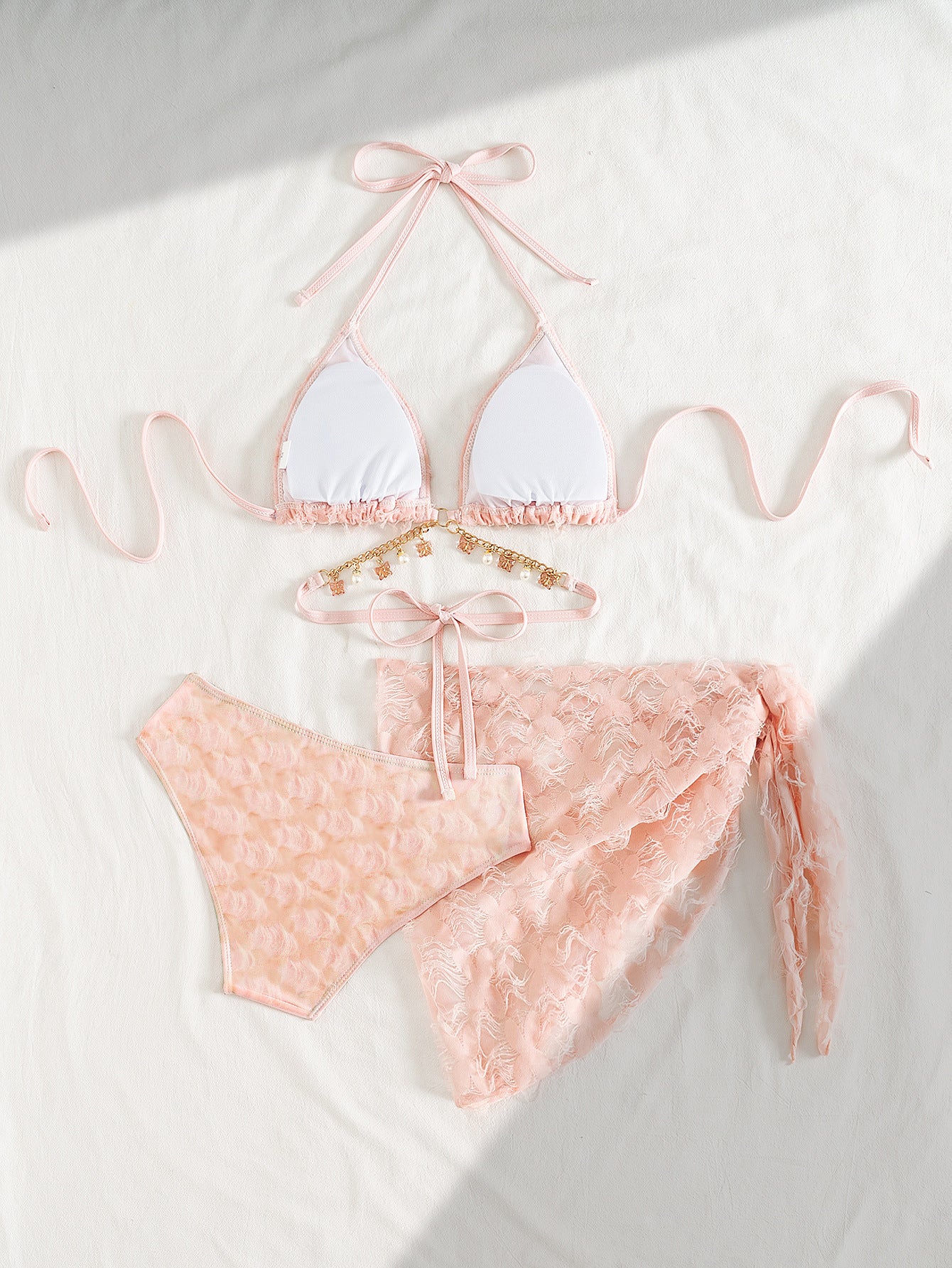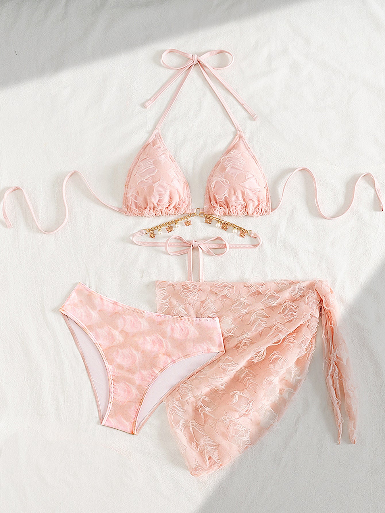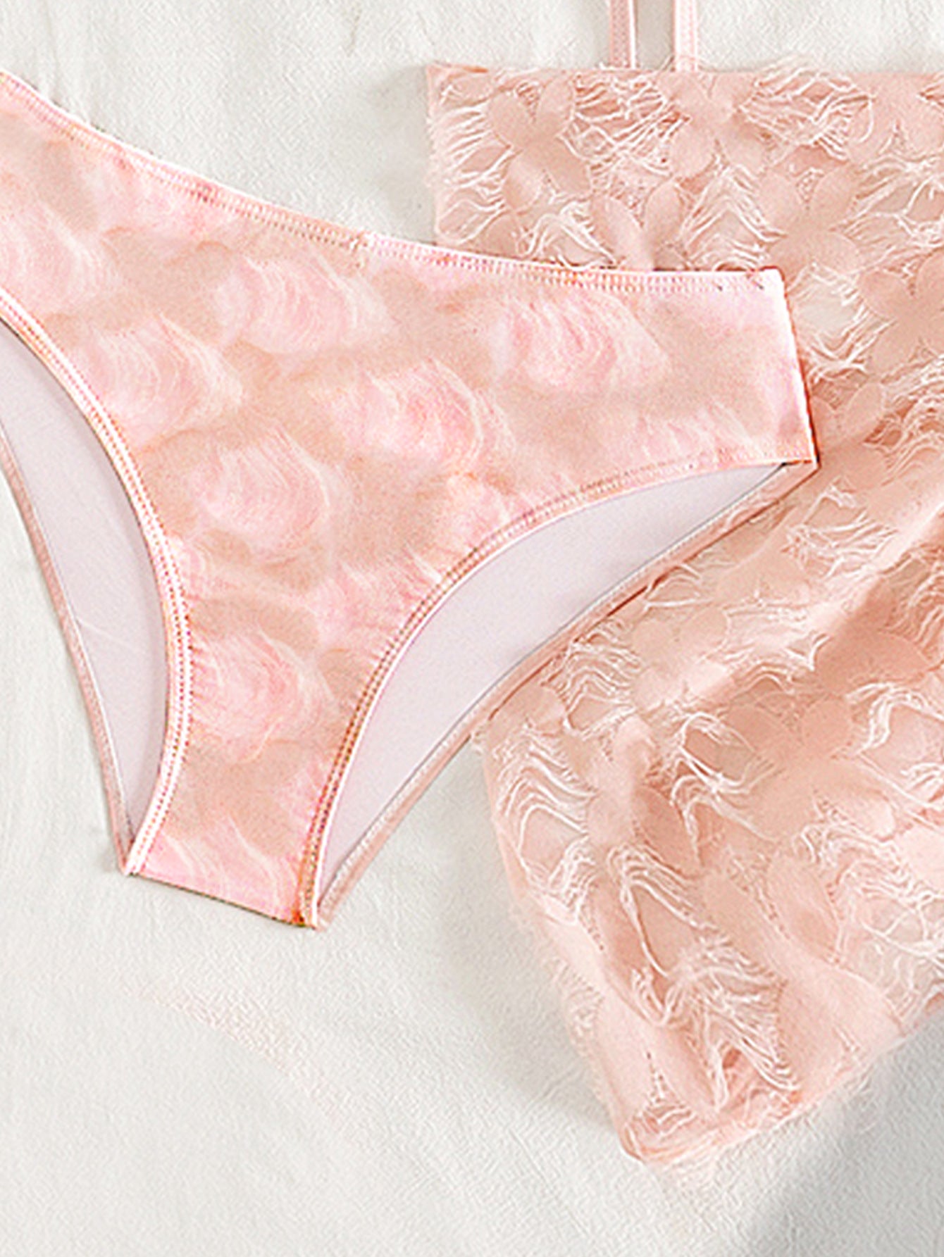 Pink High Sense Halter Swimsuit with Wrap Skirt Cover Up | Three Piece Lace Bikini Set | noémi