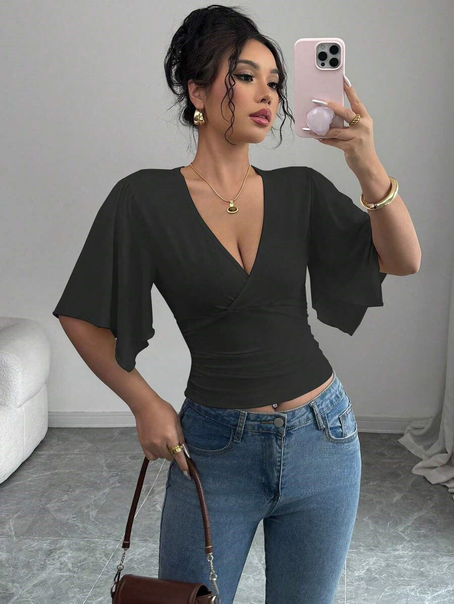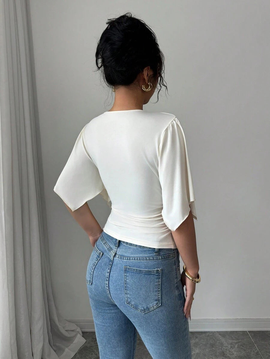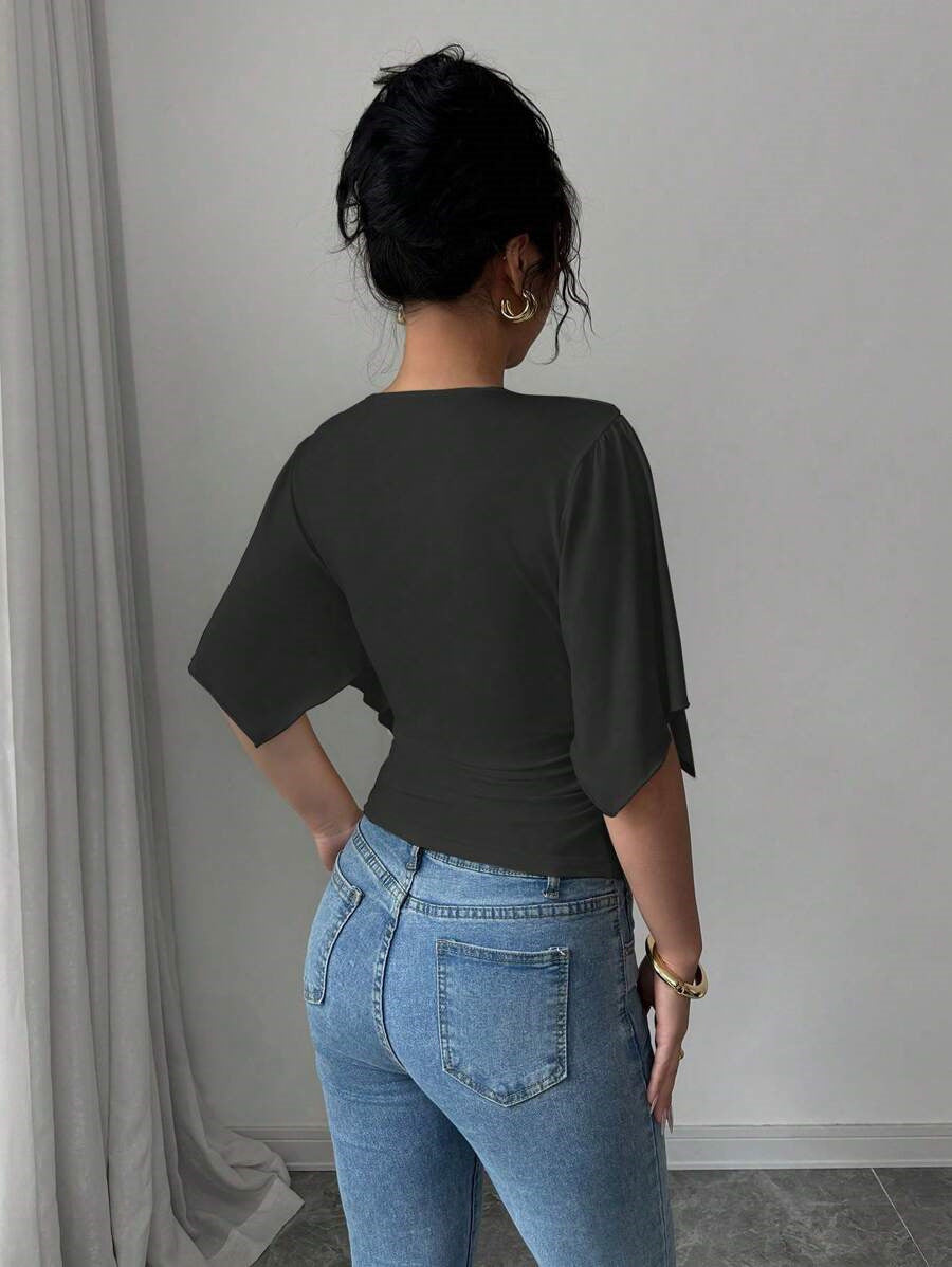 Pleated Pullover Bell Sleeve Solid Color TShirt | Women's Slim Fit VNeck Wrap Top | noémi