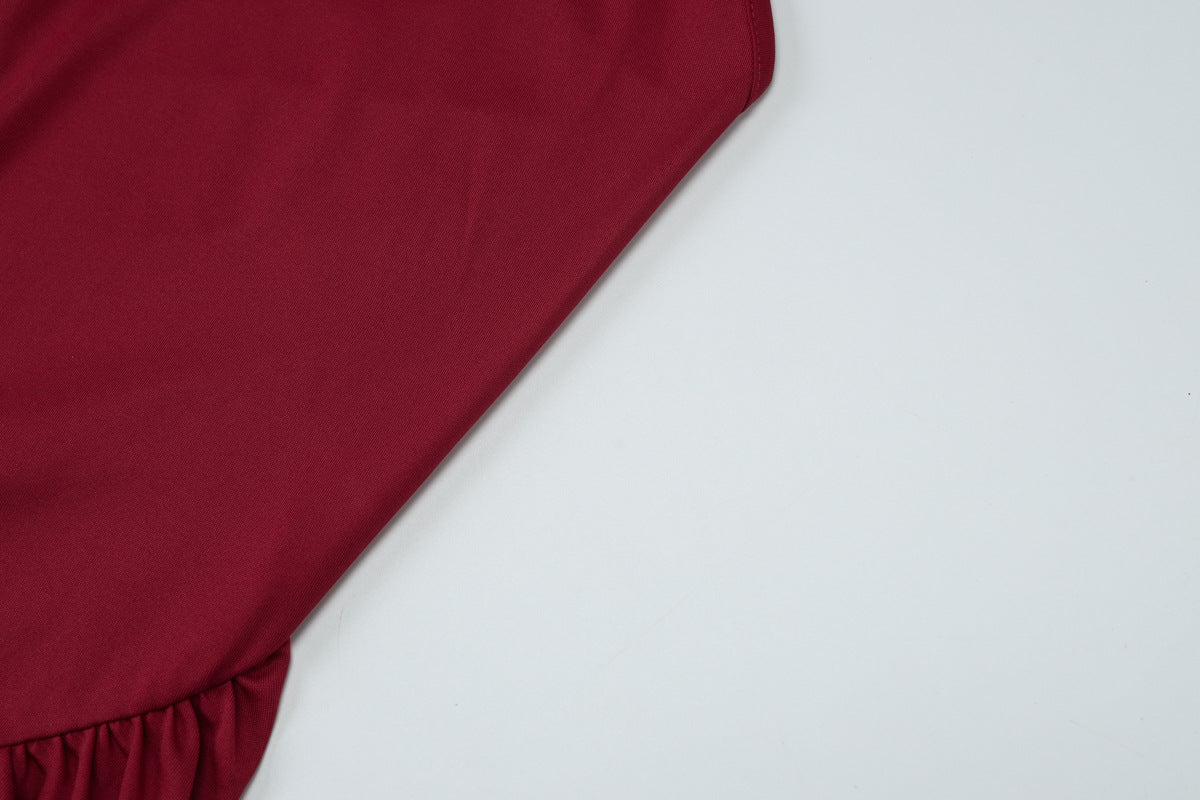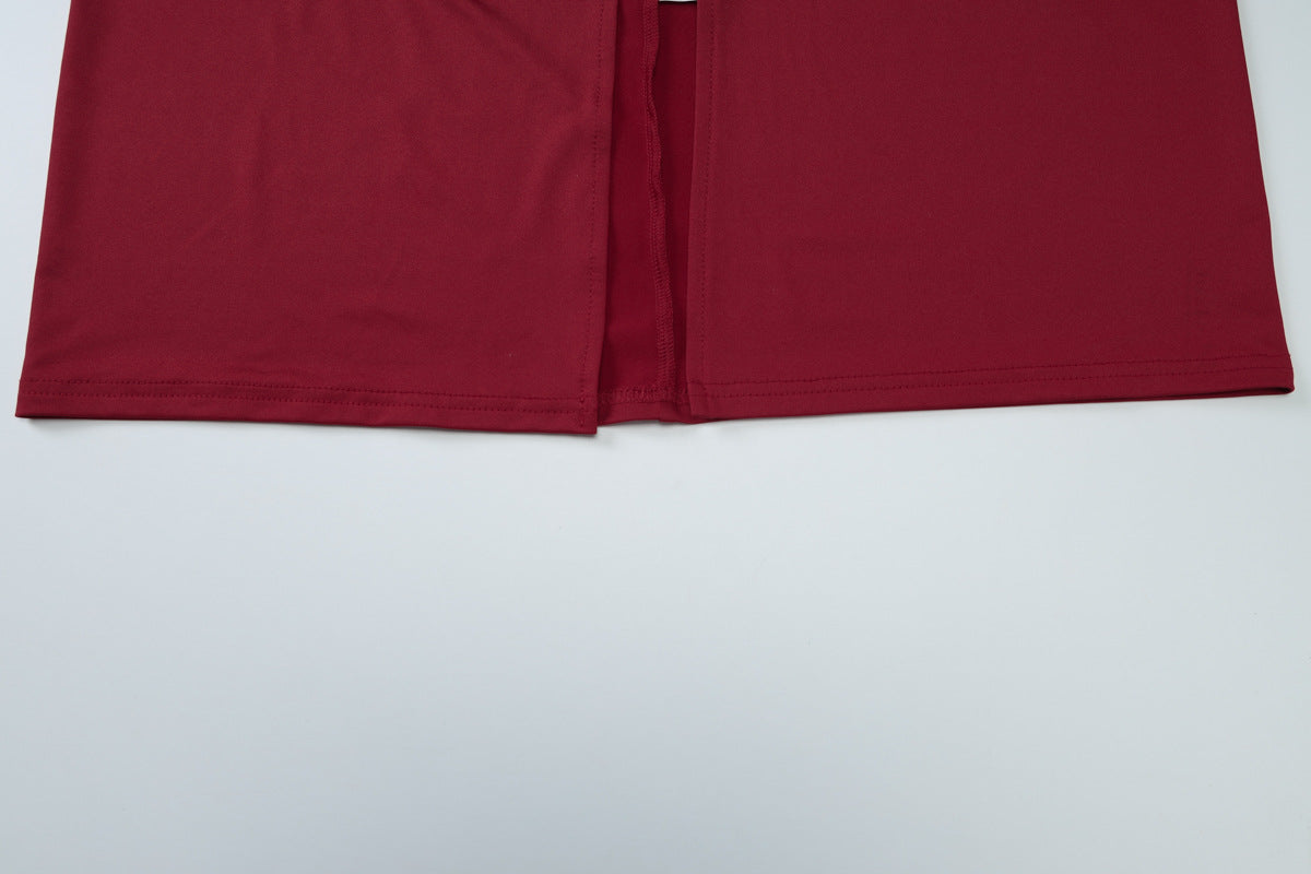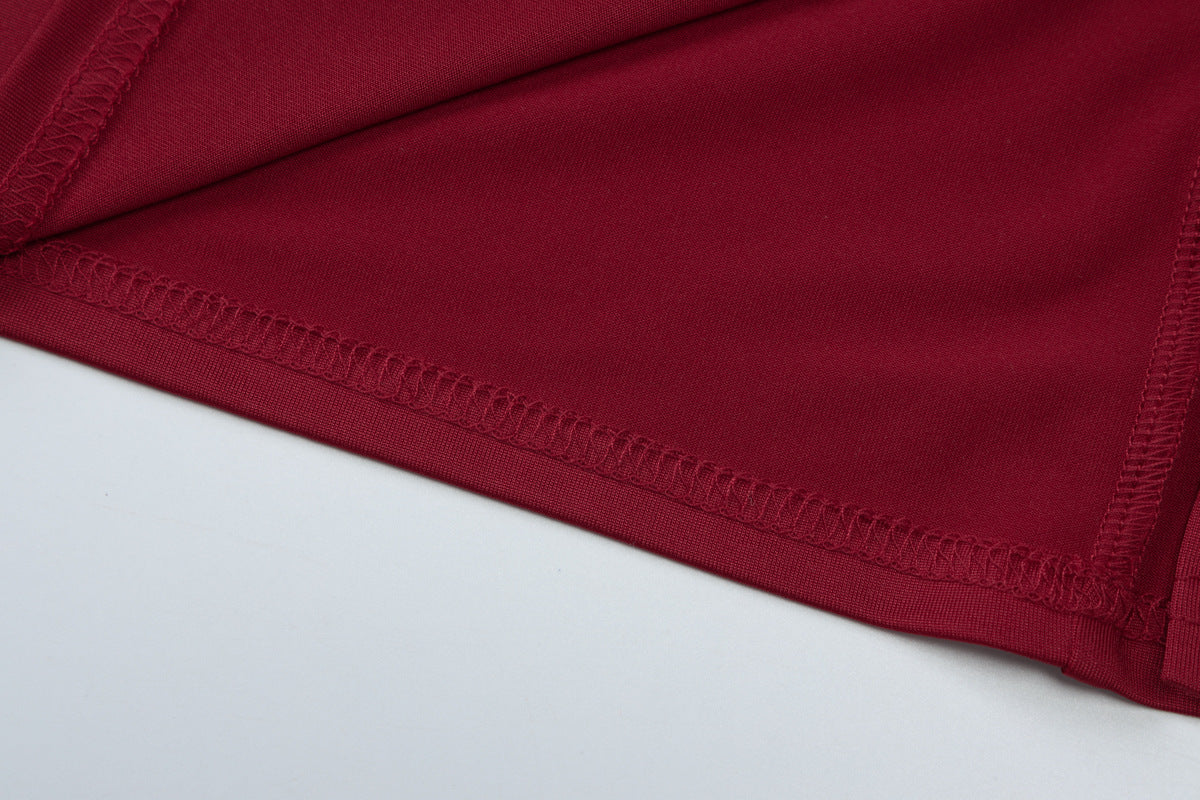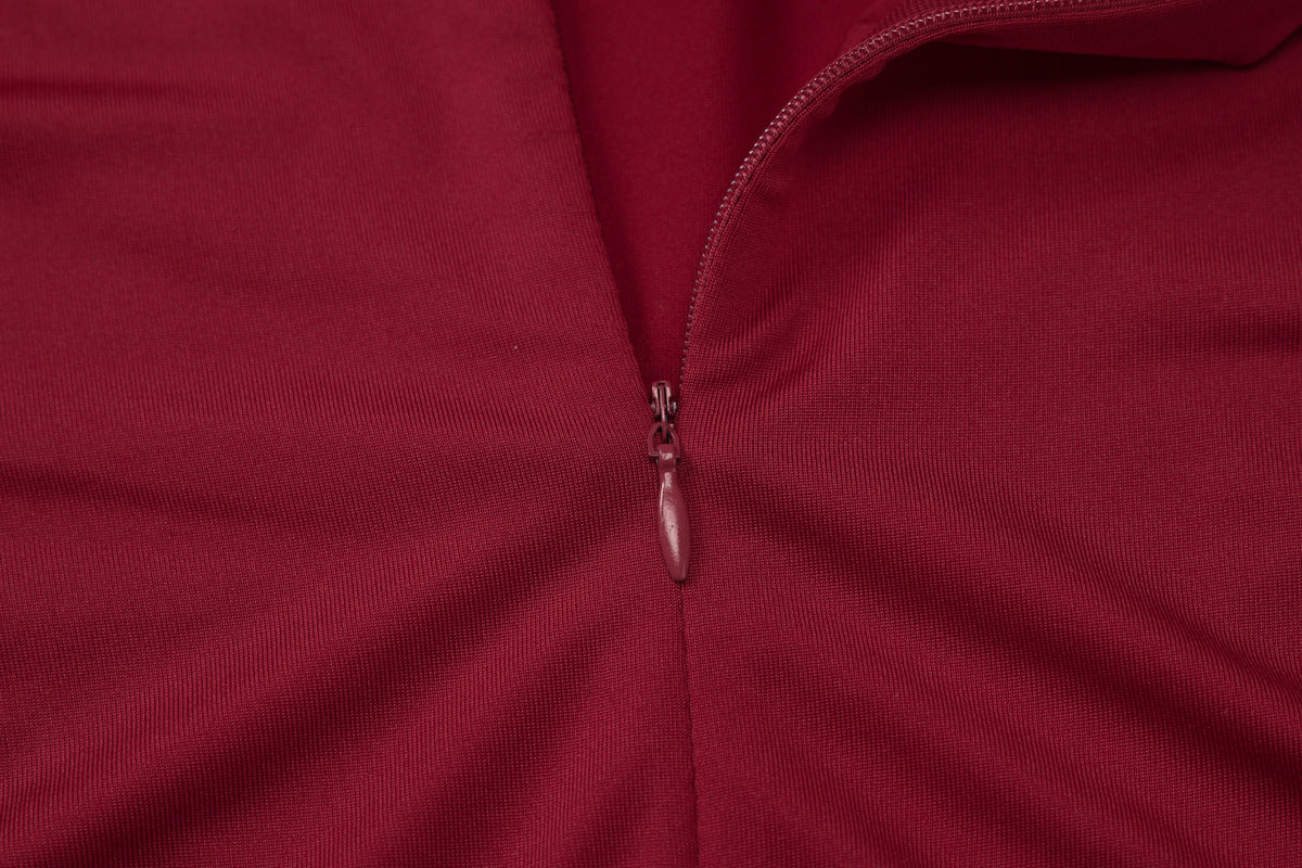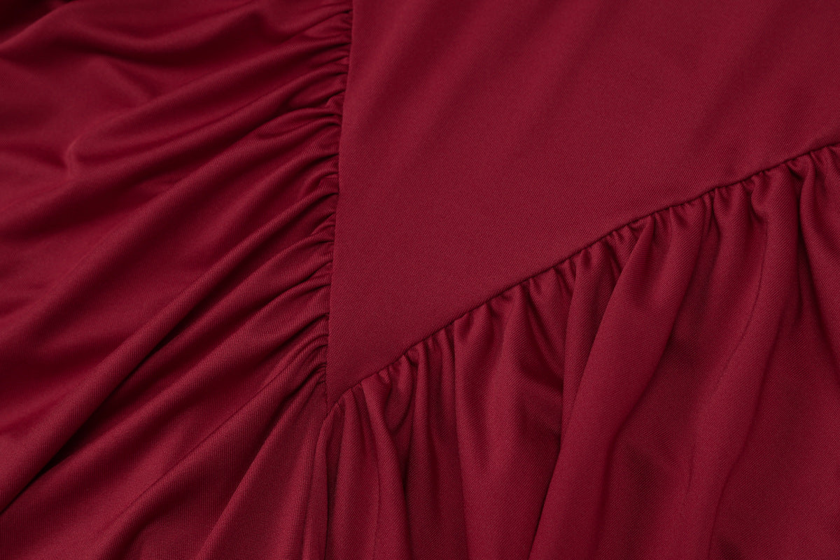 Crafted in a rich wine red shade, the fabric stretches to flatter your silhouette while the back zipper ensures a seamless fit. The front pleating adds movement and elegance, while the side gathers accentuate your waist beautifully.