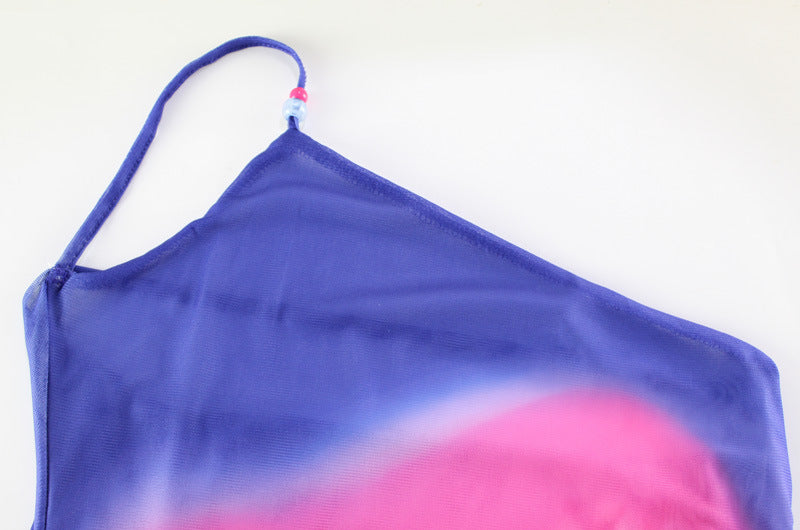 Printed Slim Fit Slit Dress | Diagonal Collar, Bare Back, Spaghetti Straps | noémi