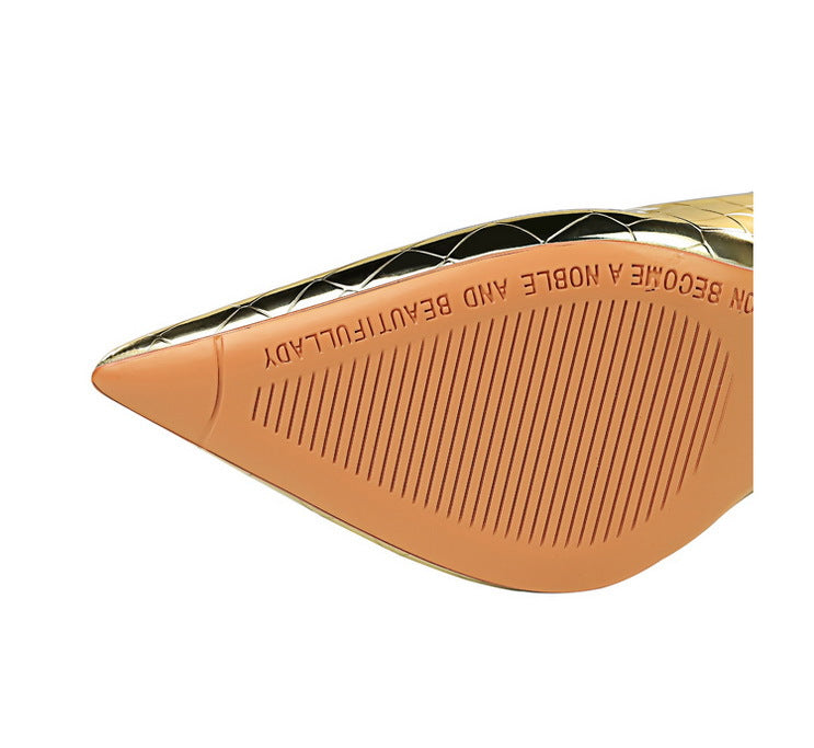 Crafted with a shimmering crocodile textured metallic finish, these pointed-toe heels elongate your legs and elevate any outfit. Whether you’re strutting into a party, stepping onto the red carpet, or adding edge to a night-out look, these stilettos were made to steal the spotlight.