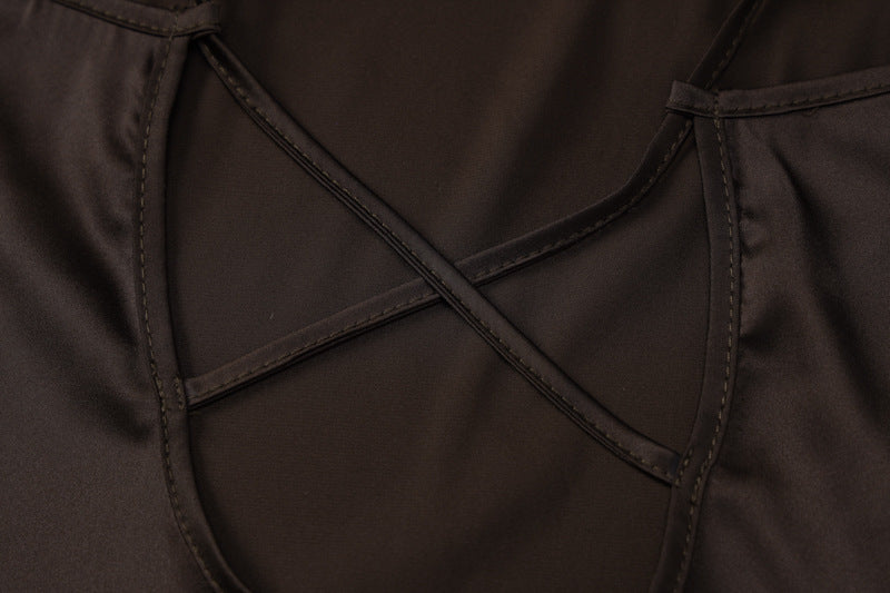 Discover the perfect balance of smooth texture and refined silhouette with this satin sheath dress featuring an off neck design and backless detail.