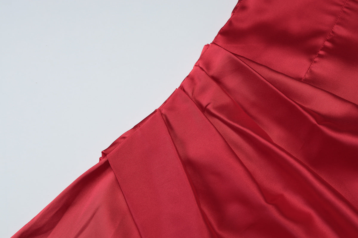 Crafted from silky smooth satin, this dress hugs your figure with a flattering slim fit, while delicate pleats add movement and charm.