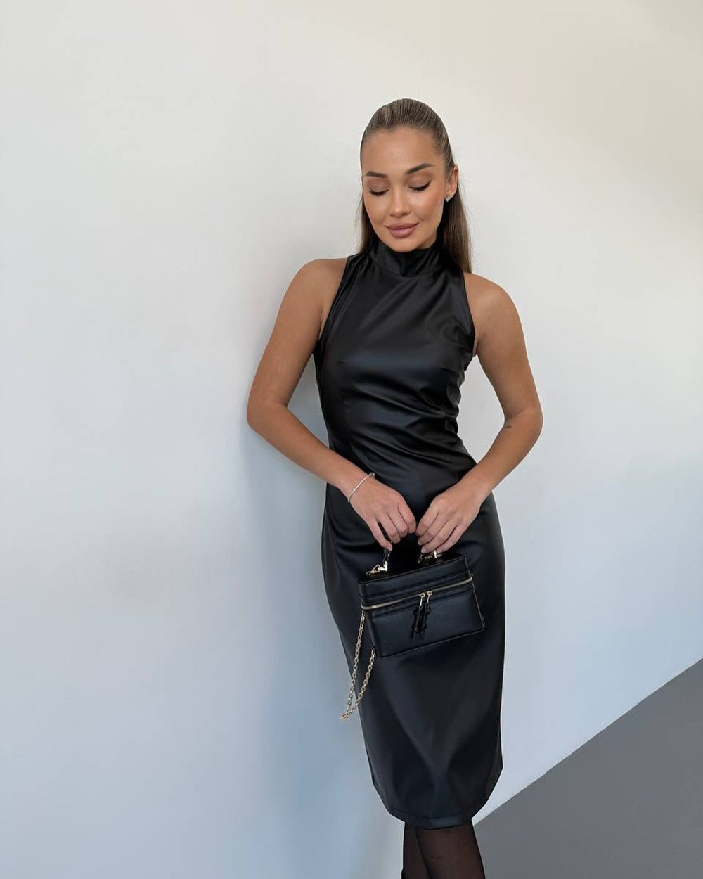 Crafted from sleek faux leather, this sleeveless dress features a modern stand collar and a sharp side split for a clean yet structured silhouette.