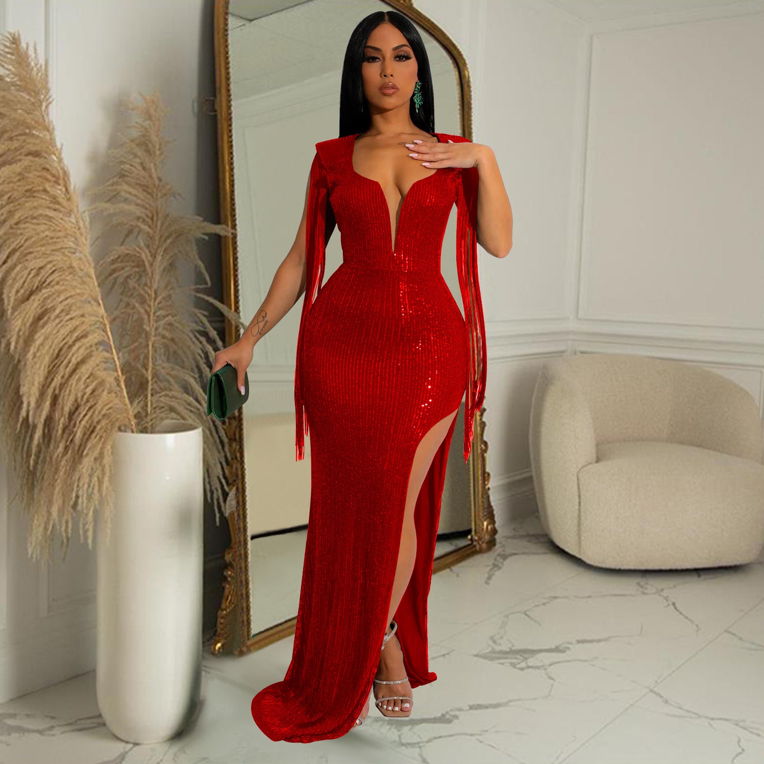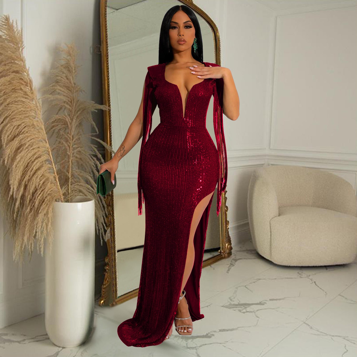 Sleeveless V Neck Backless Dress with Sequin Tassel Detail in Solid Color | noémi