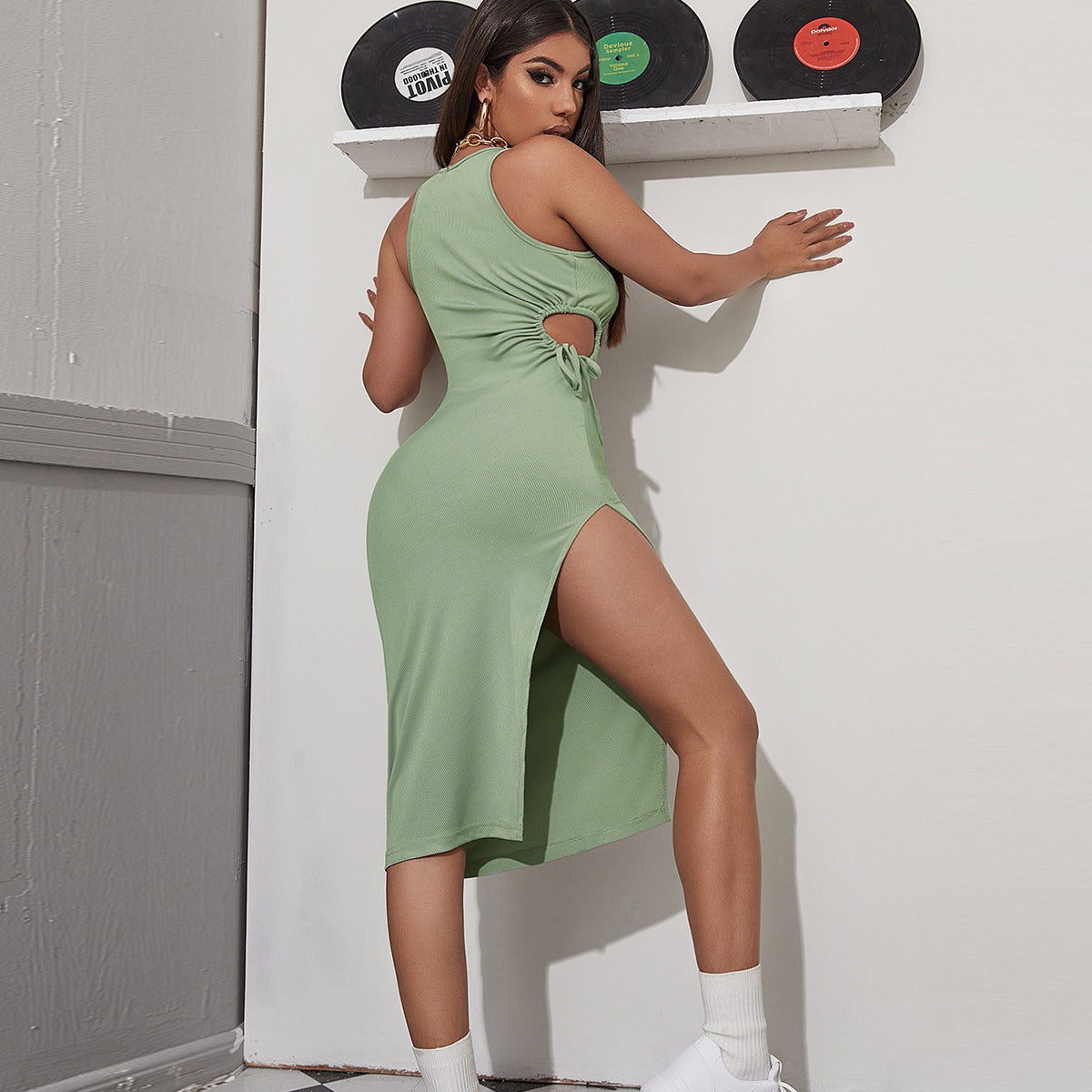 Strap Dress With Side Cutout Tied Detail Pleated Skirt And Thigh Slit | noémi
