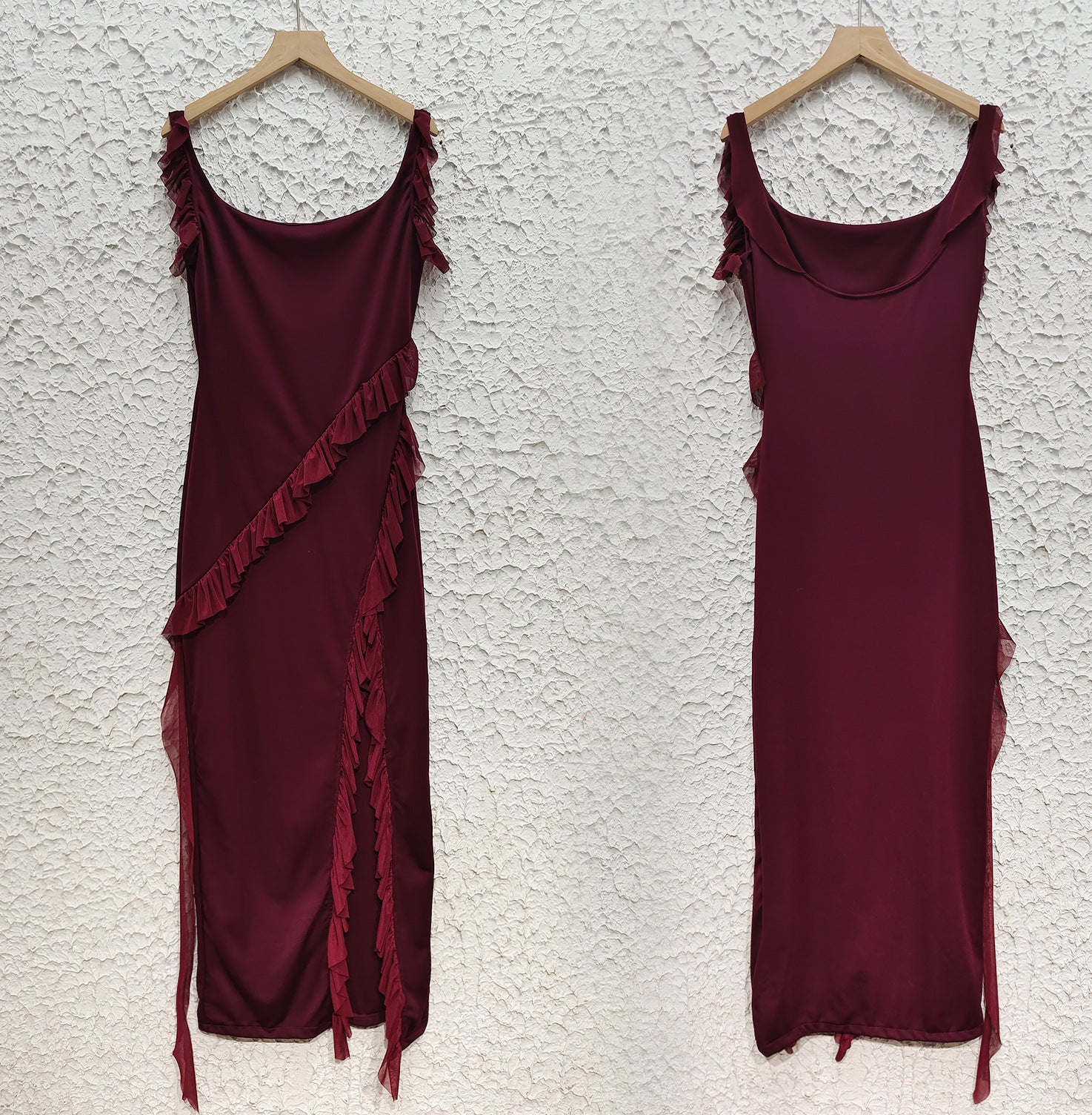 Featuring unique wooden ear strap details and a daring split print, this dress is perfect for sun-soaked days and vibrant evenings.