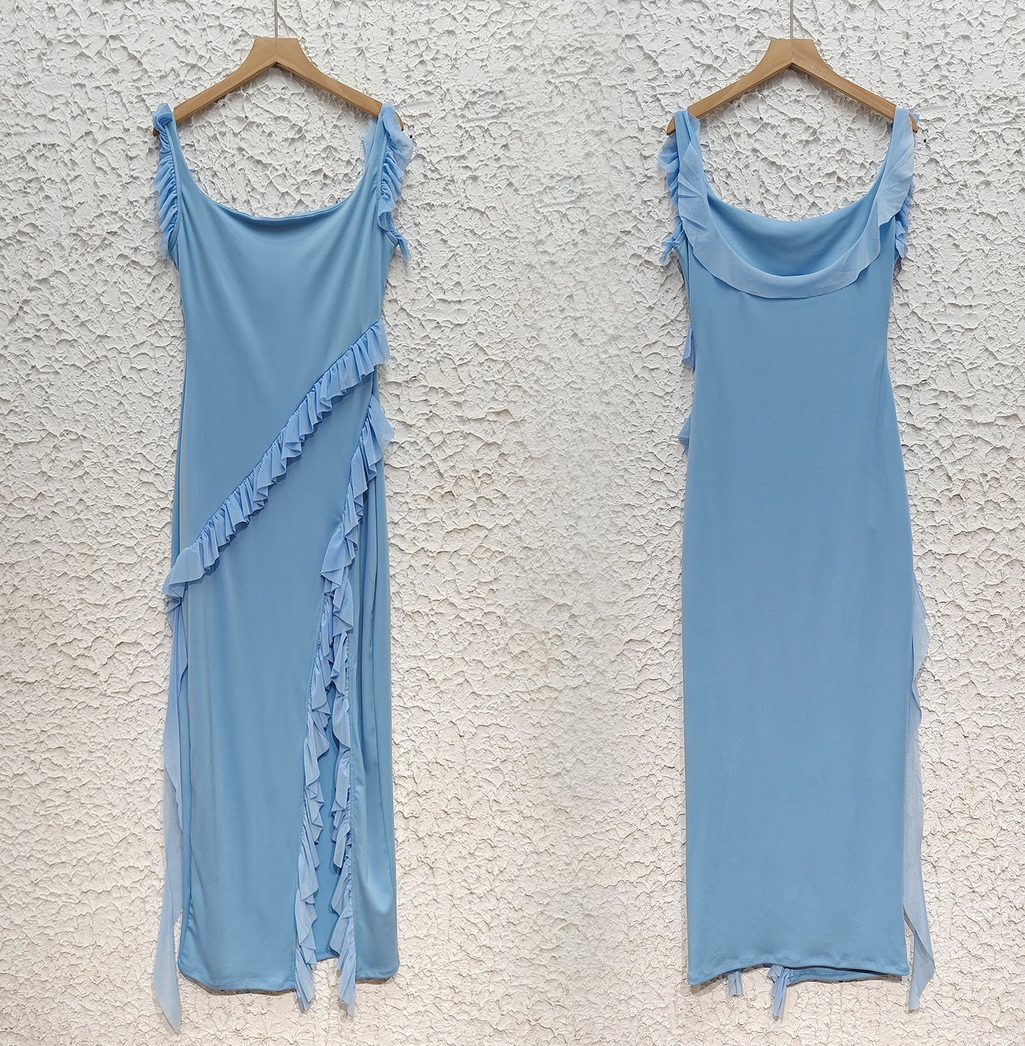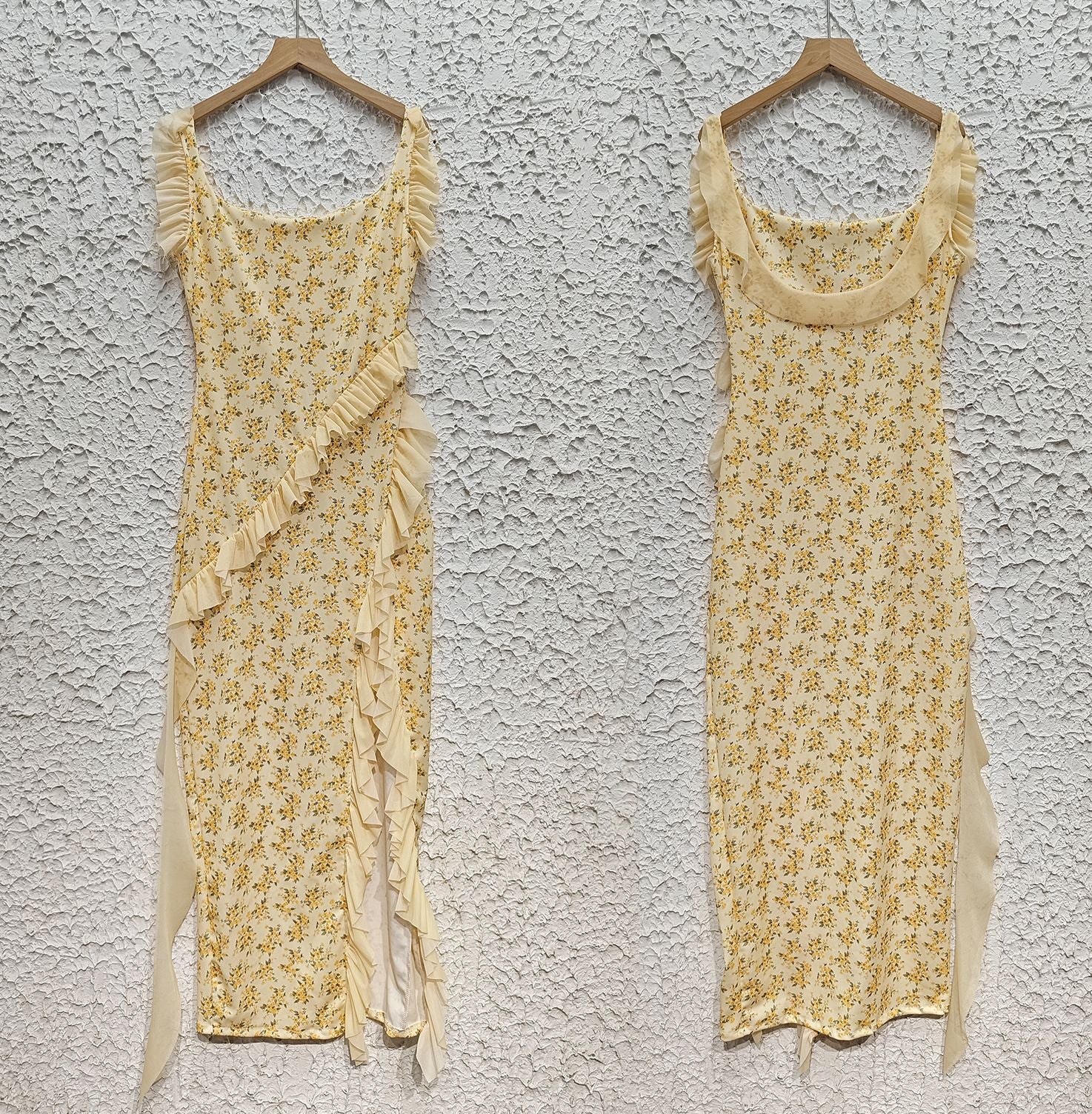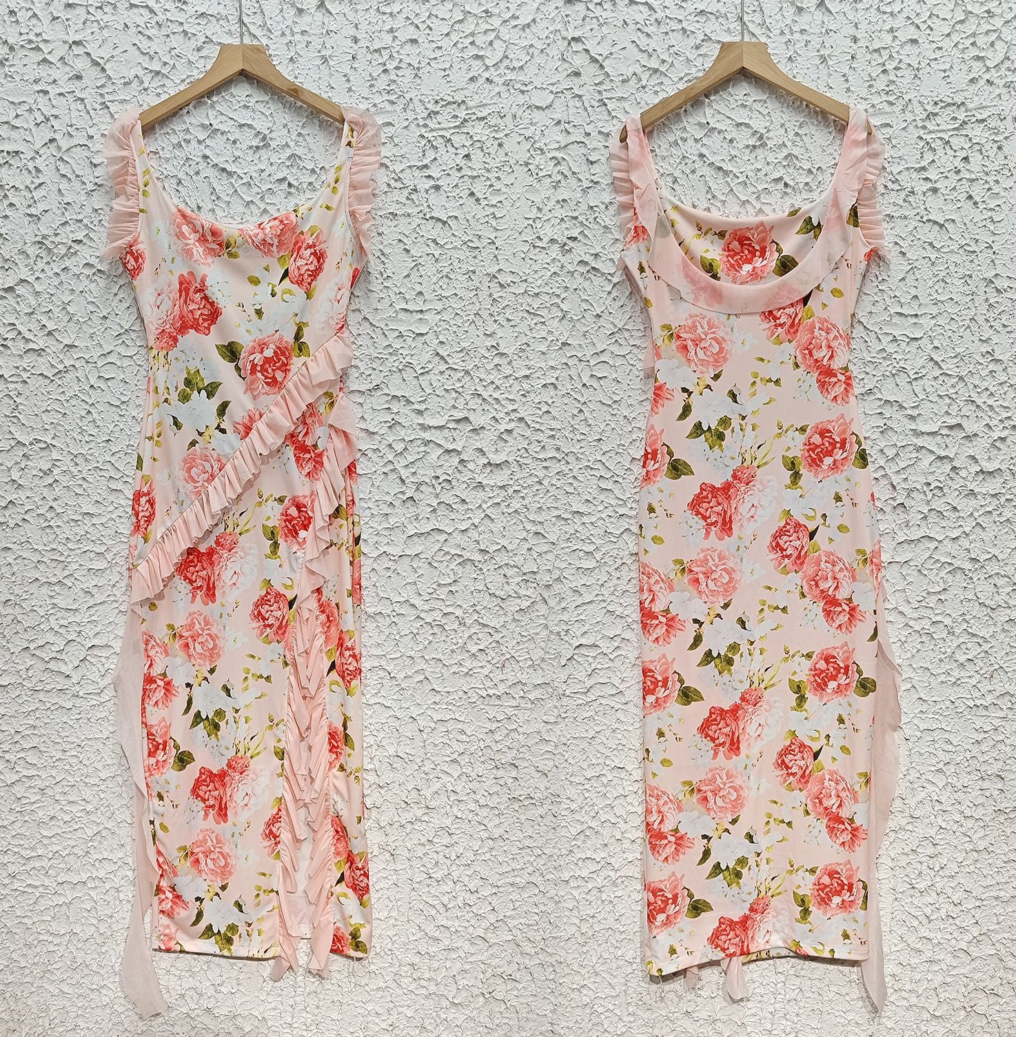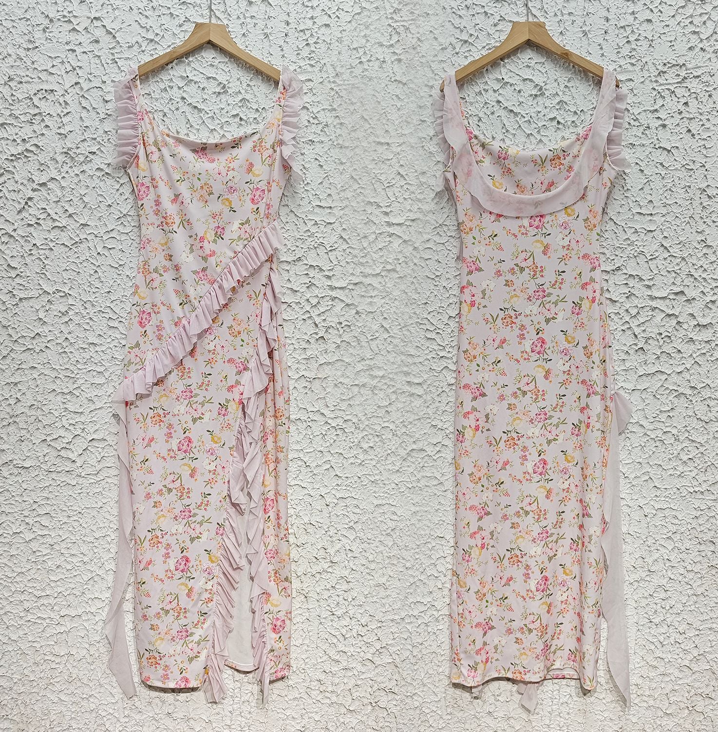 The Summer French Strap Wooden Ear Sexy Split Printing Dress from noémi blends delicate French elegance with bold, sultry style.