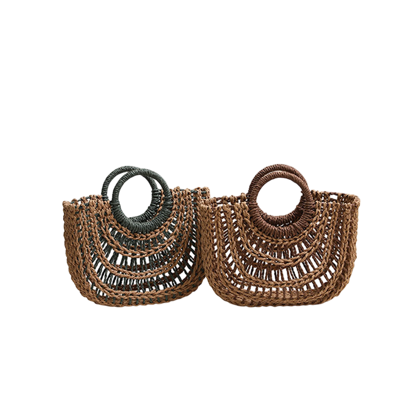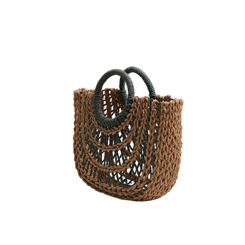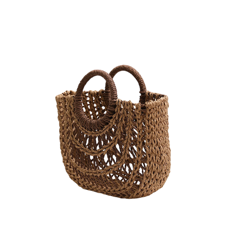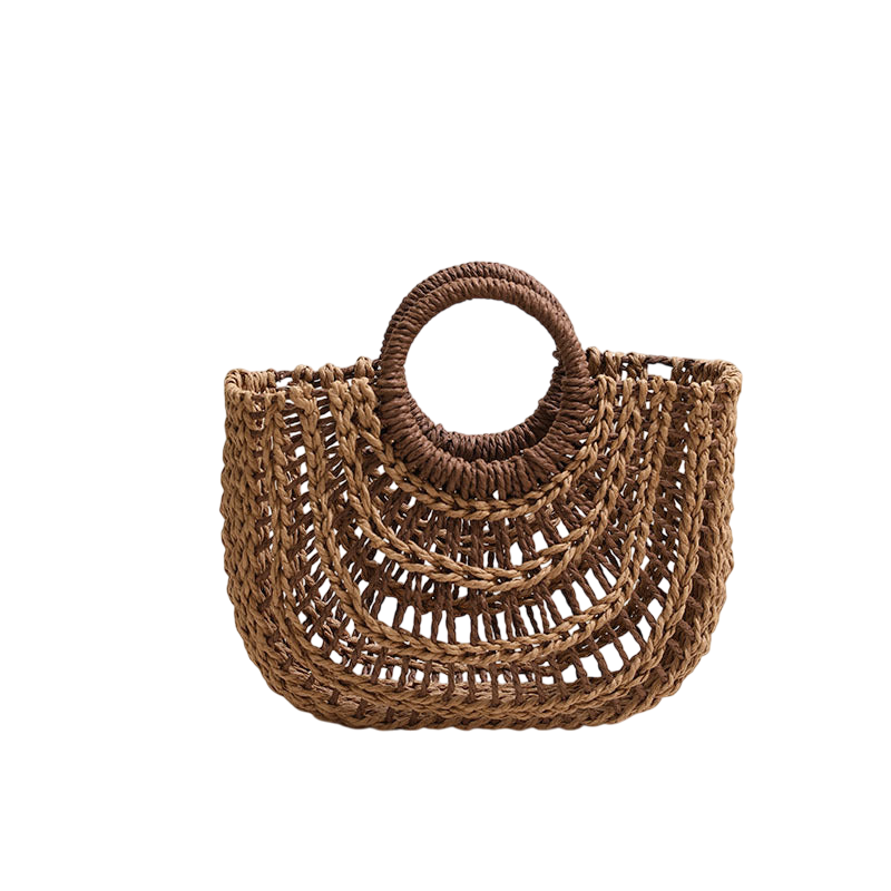 Straw Half-Moon Tote Bag – Hollow-Out Weave, Round Handle, Natural/Coffee | noémi