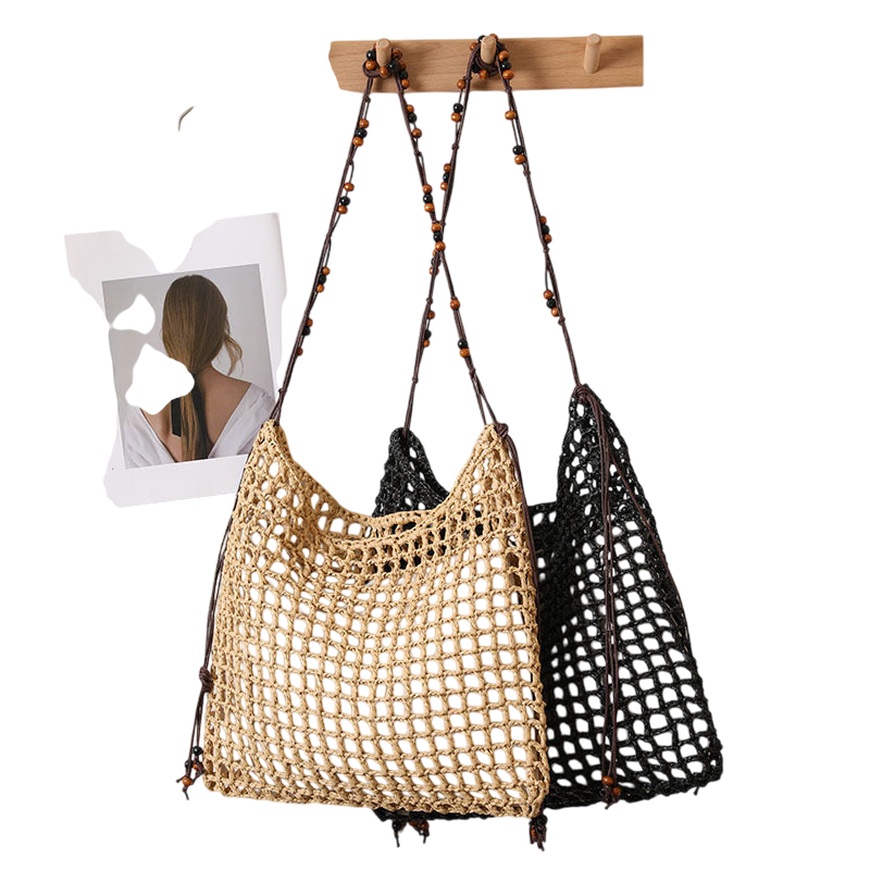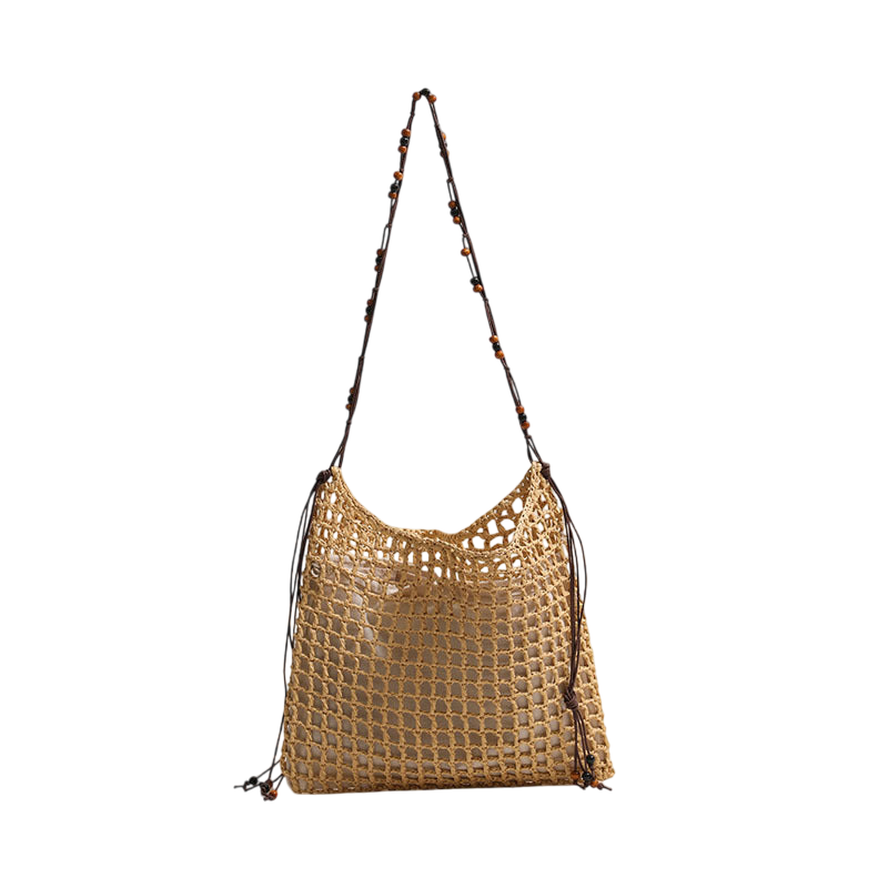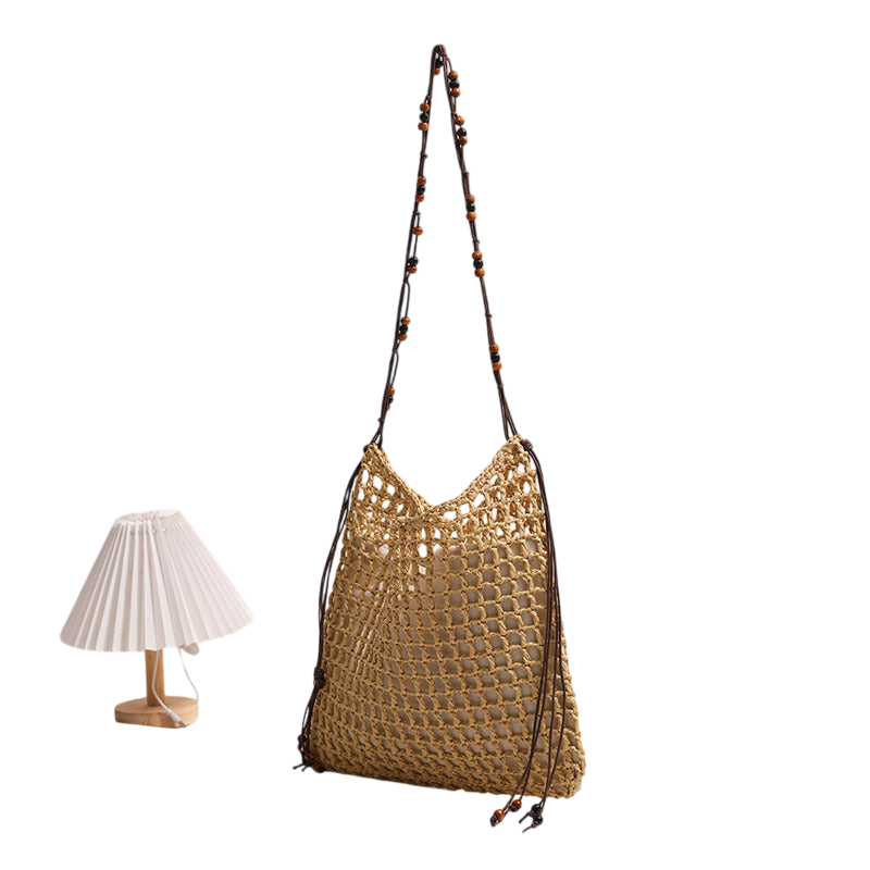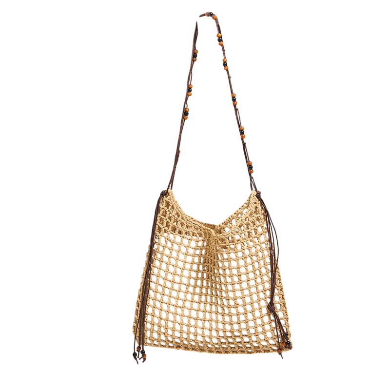 Breezy woven-straw tote with eye-catching lace-up detail hauls towels, sunscreen and market finds in carefree boho style—yet weighs only 420 g for effortless carry.