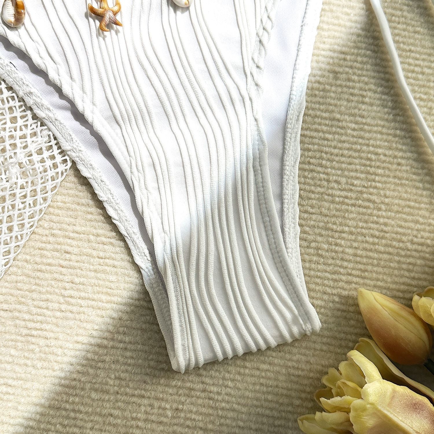 Elevate your beach look with this Starfish Tassel Three-Piece Bikini Set, featuring a delicate yarn skirt and charming starfish accents.