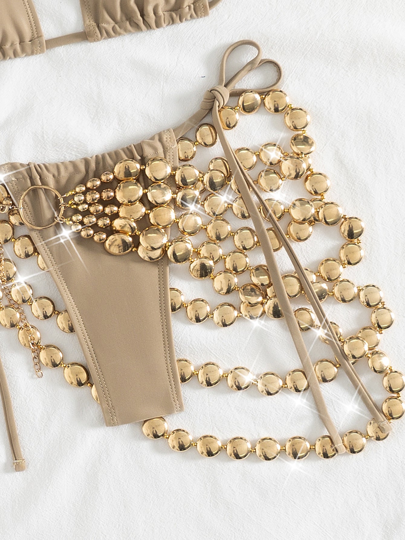 This bold three piece bikini set combines sharp detail with layered versatility.