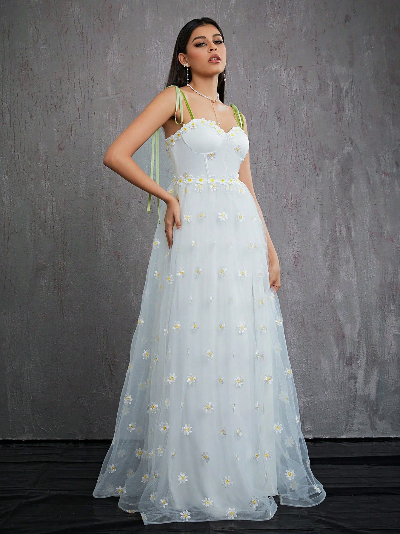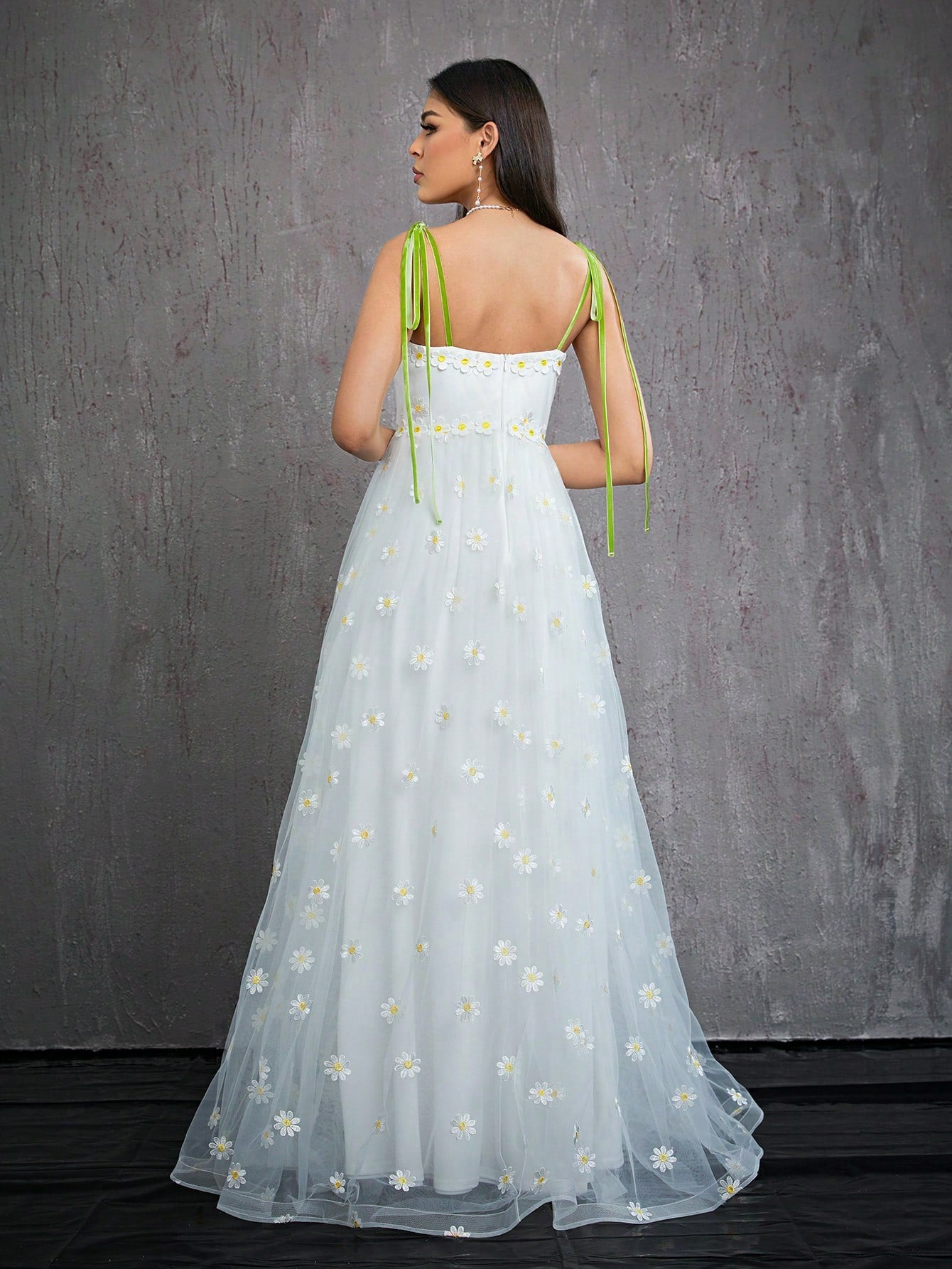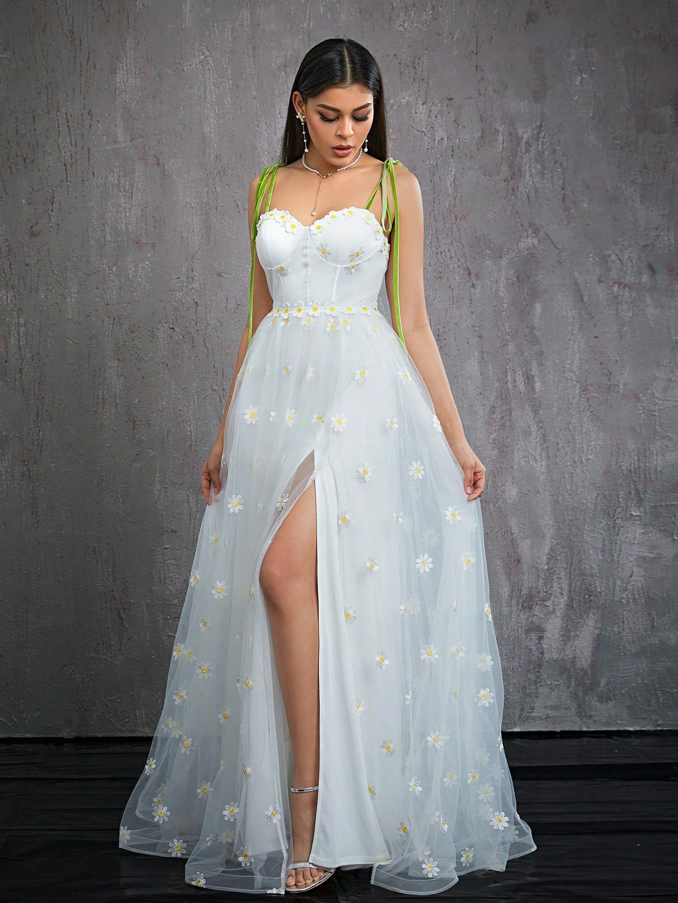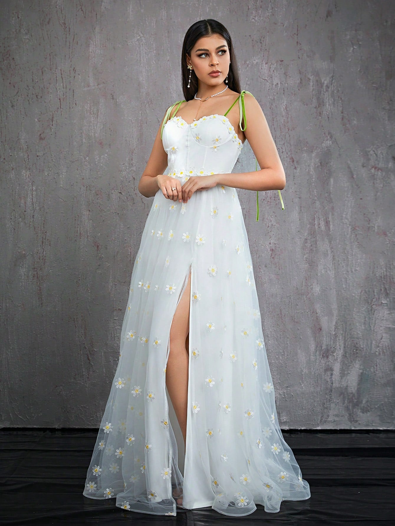 This standout gown features a sleek tube top with delicate suspender straps, a daring thigh-high slit, and handcrafted floral embellishments that bloom across the bodice like midnight roses.