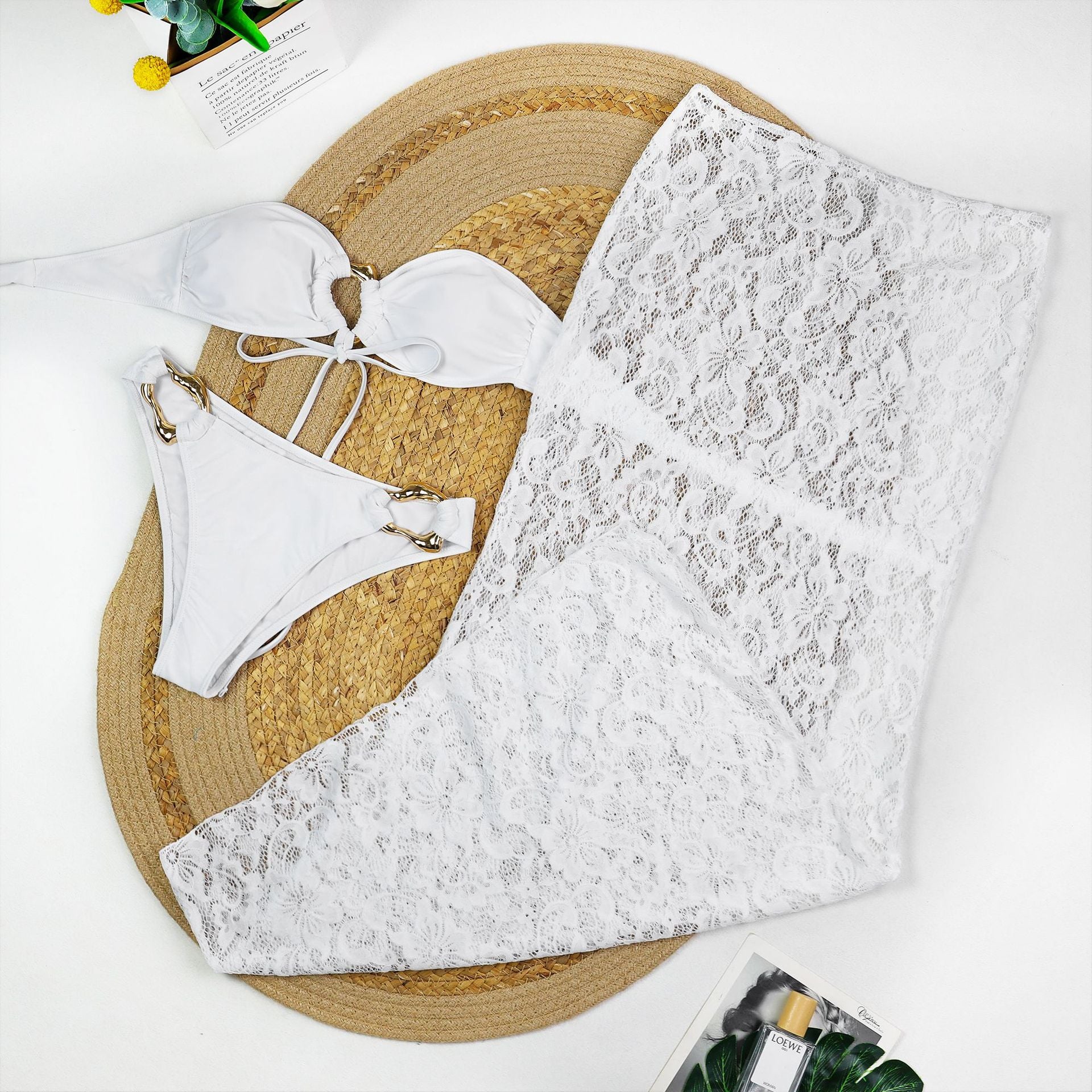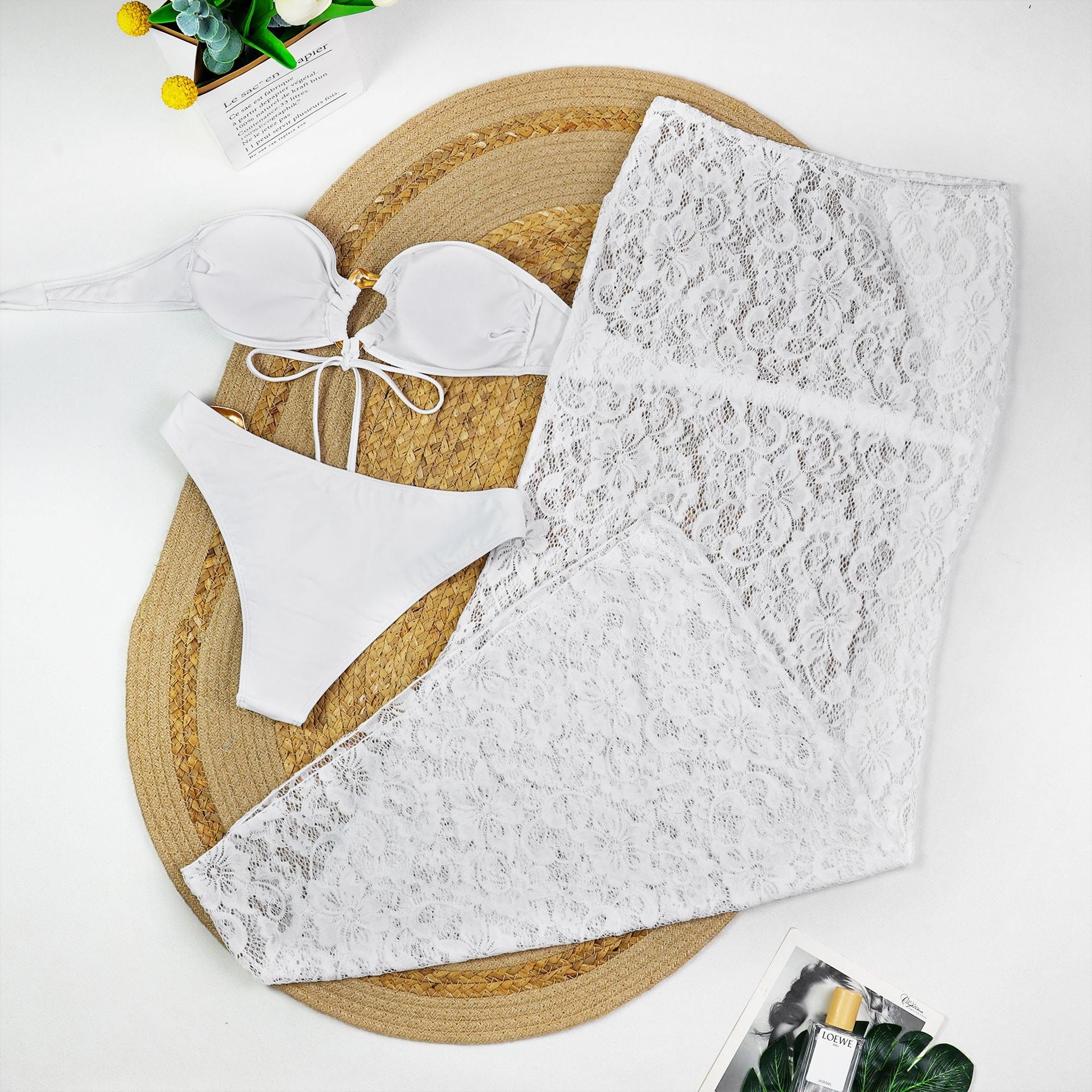 Discover the perfect blend of style and versatility with this Tube Top Metal Buckle Bikini paired with a Lace Maxi Dress in a convenient three piece set.