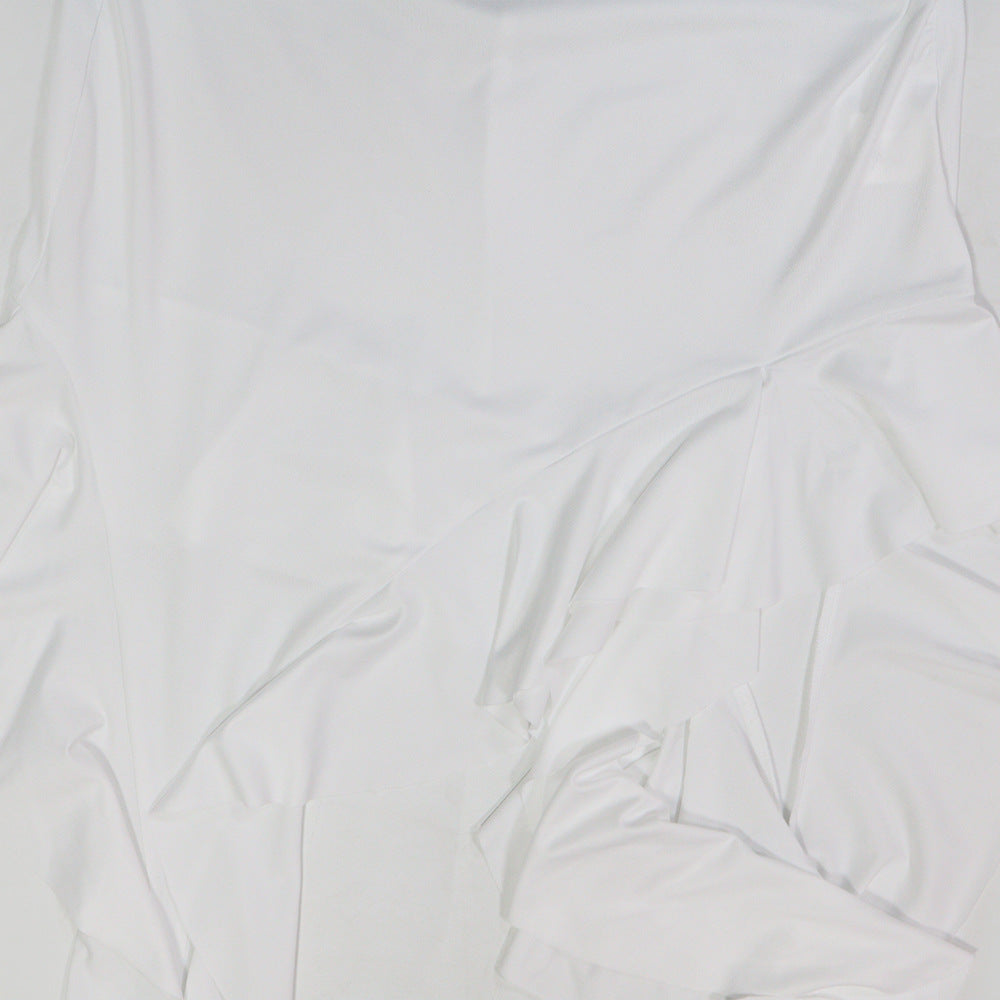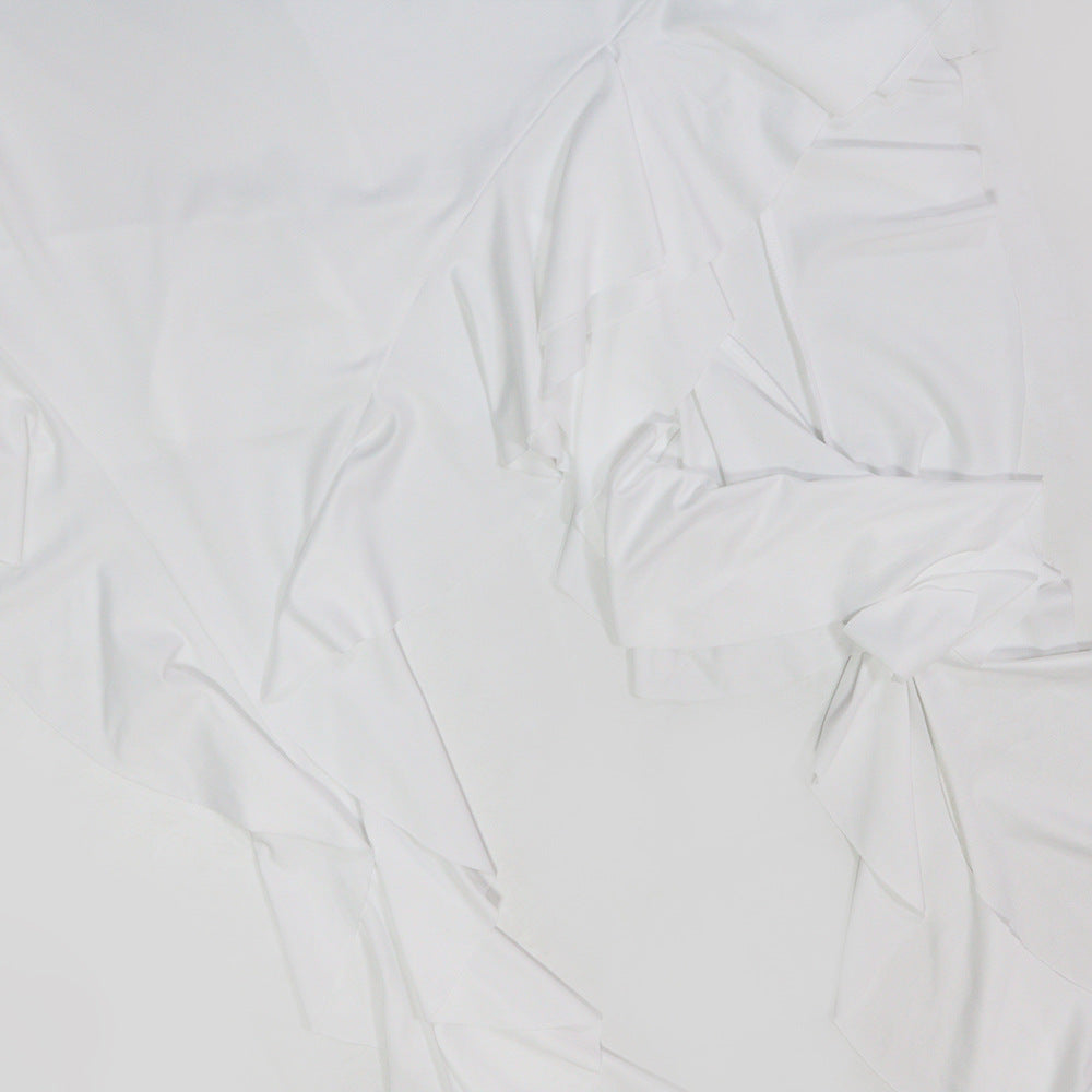 Crafted in a sleek solid color, this dress features a playful asymmetric hem and cascading ruffles that dance with every move.