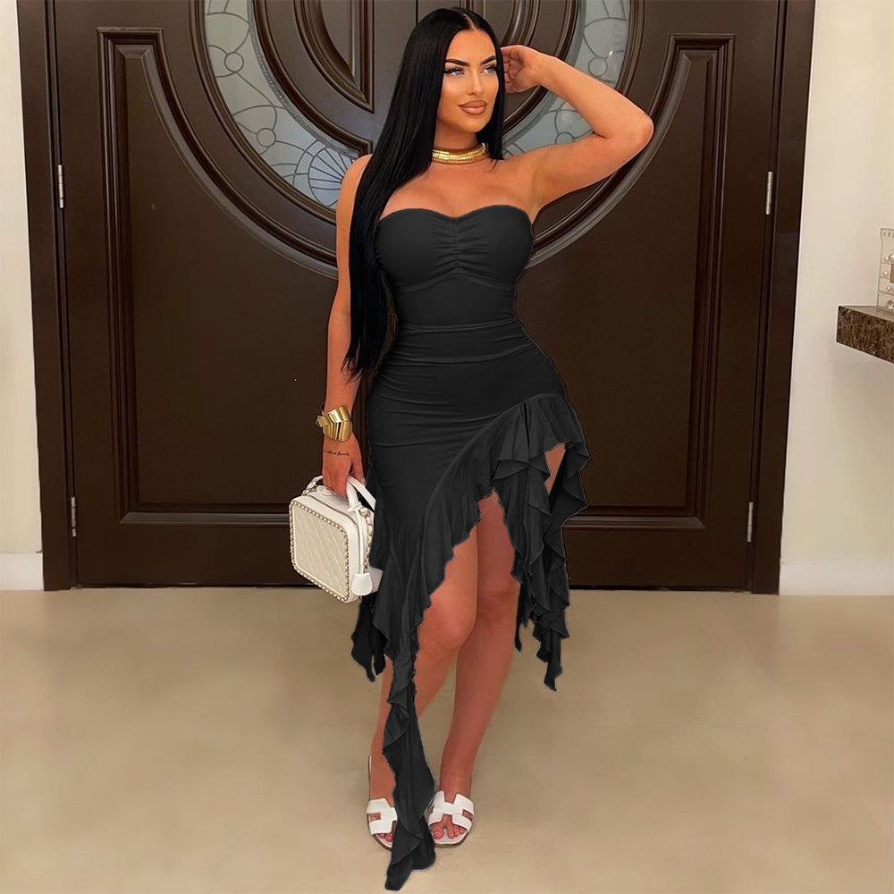 Step into the spotlight with noémi’s Tube Top Irregular Asymmetric Ruffle Dress — where bold design meets effortless elegance.
