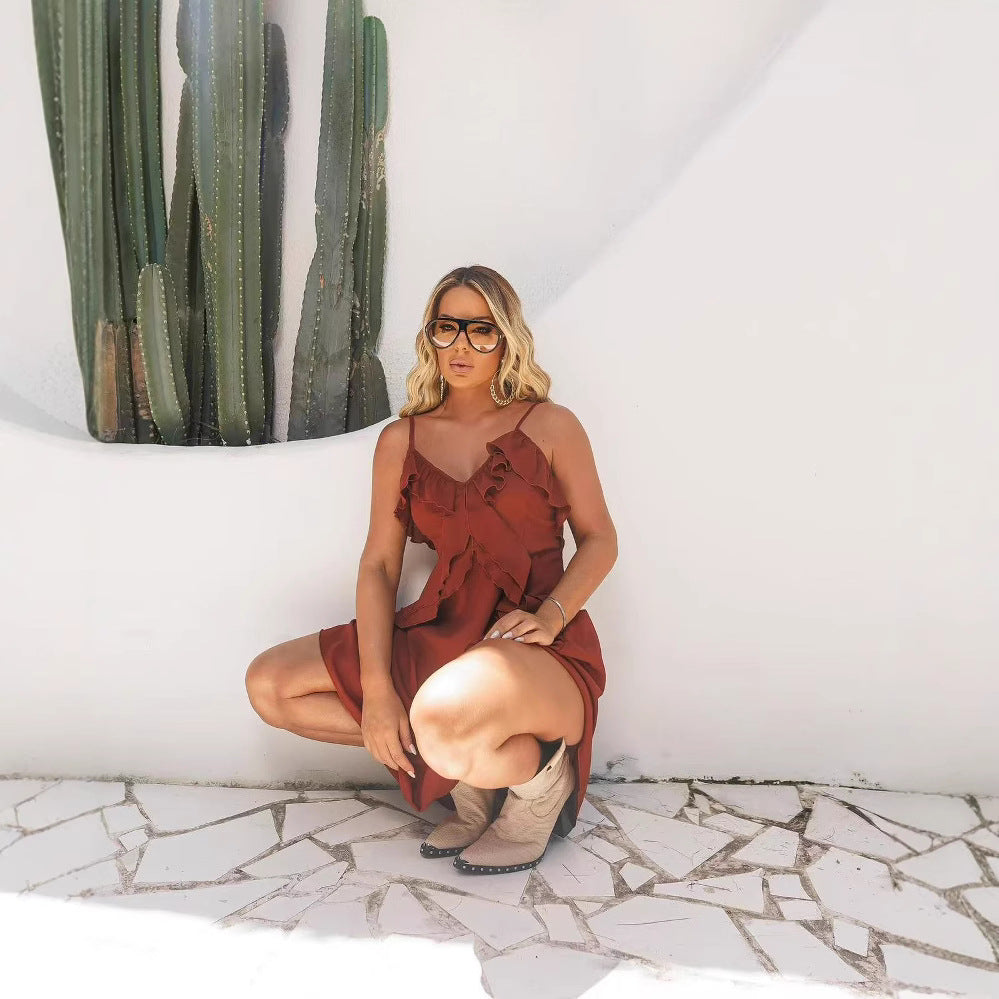 Women Patchwork Ruffle Slit Maxi Dress Slim Fit Sling Style | noémi