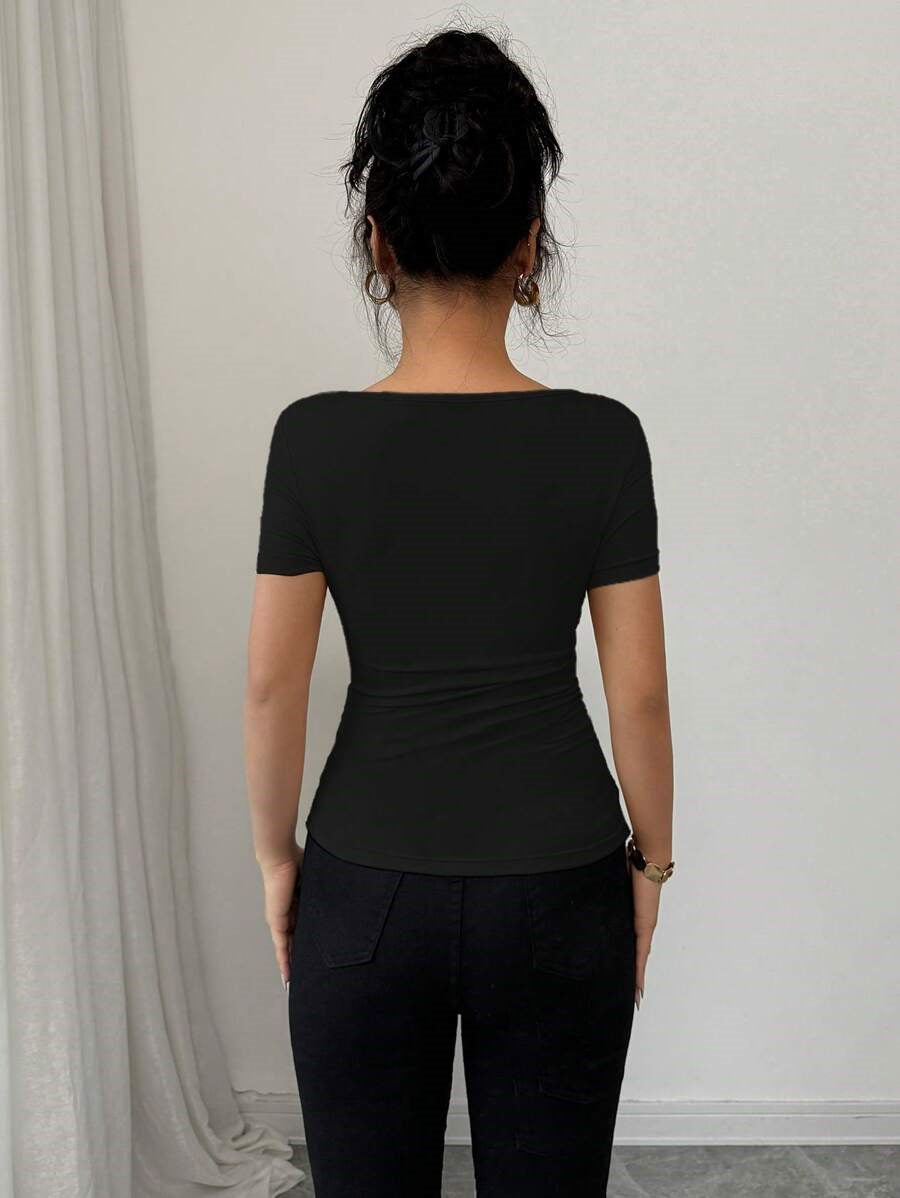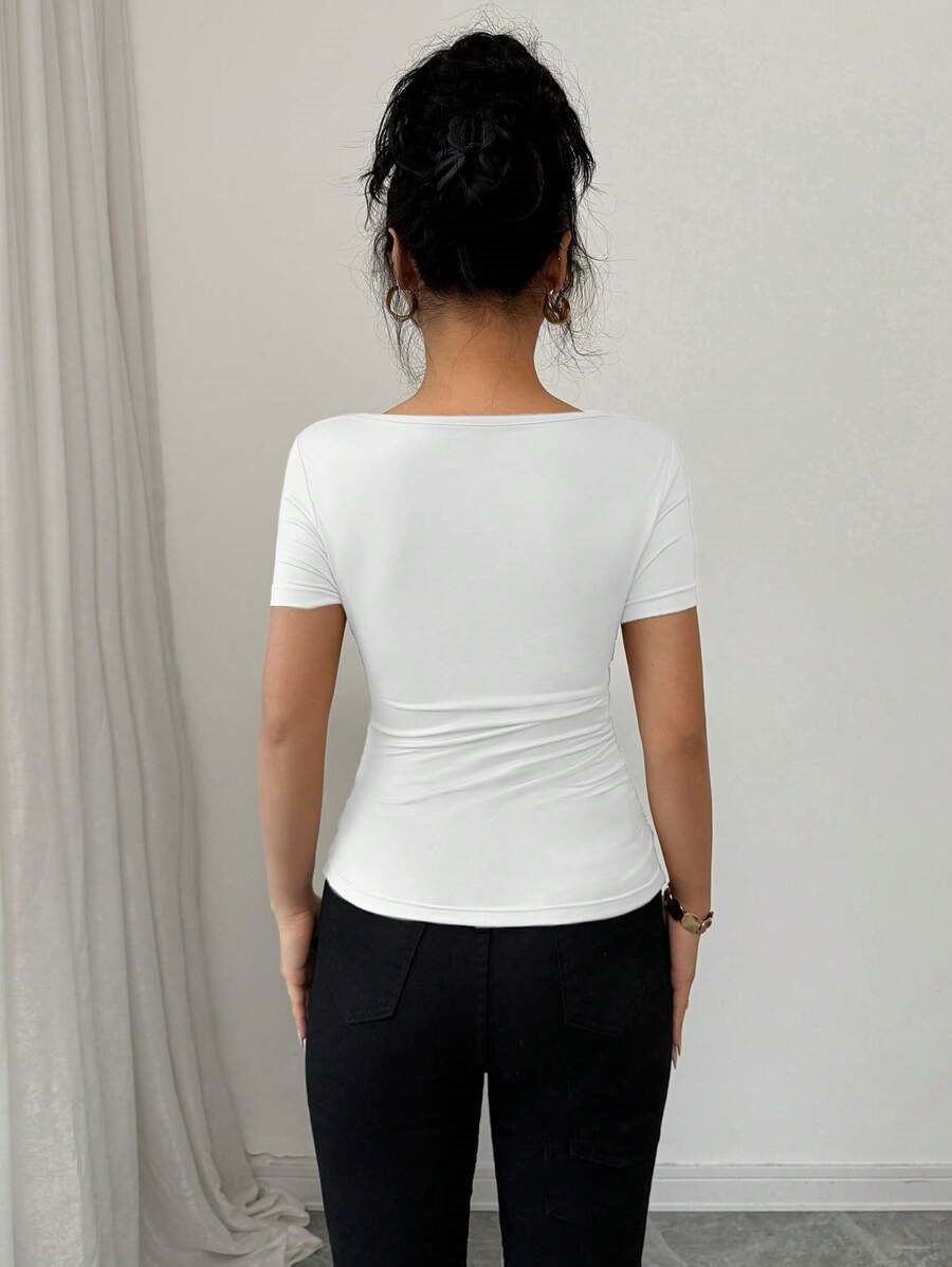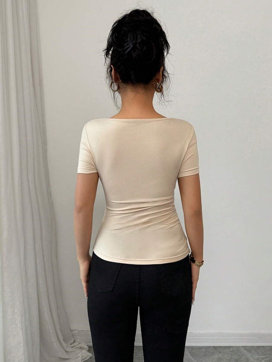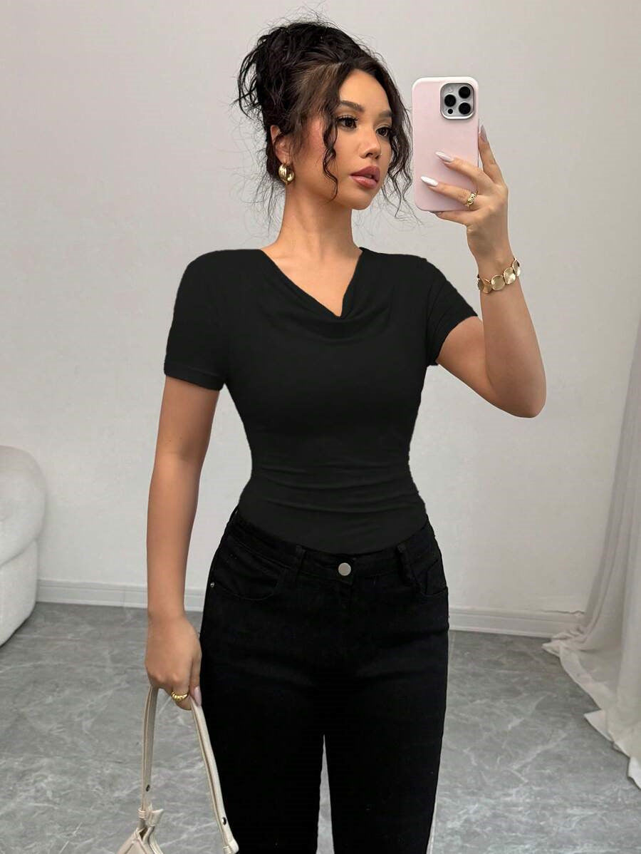 Slip into sleek sophistication with our Embellished Asymmetric Pleated Tee the ultimate blend of minimalism and charm. Designed to hug your shape in all the right places, this short sleeve top features a soft draped neckline, subtle side pleats, and a premium stretch fit that flatters from every angle.