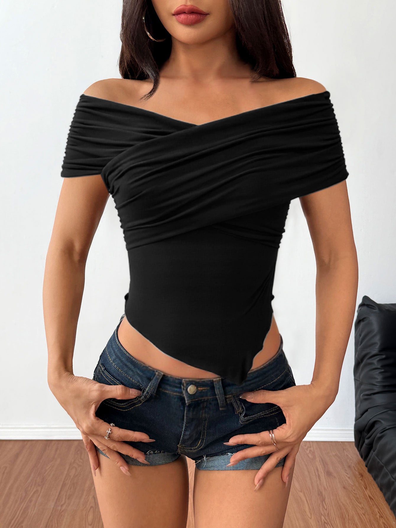 Ready to turn heads? The Off Shoulder V-Neck Slim Fit Top is your new secret weapon for effortless sexy style.