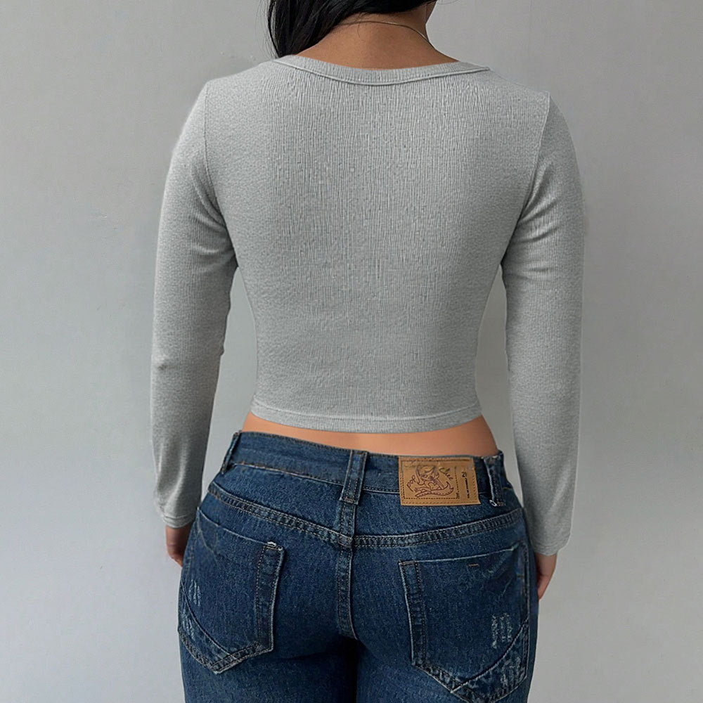 Women’s Ribbed Knit Long Sleeve Crop Top | Diagonal Button Detail | noémi