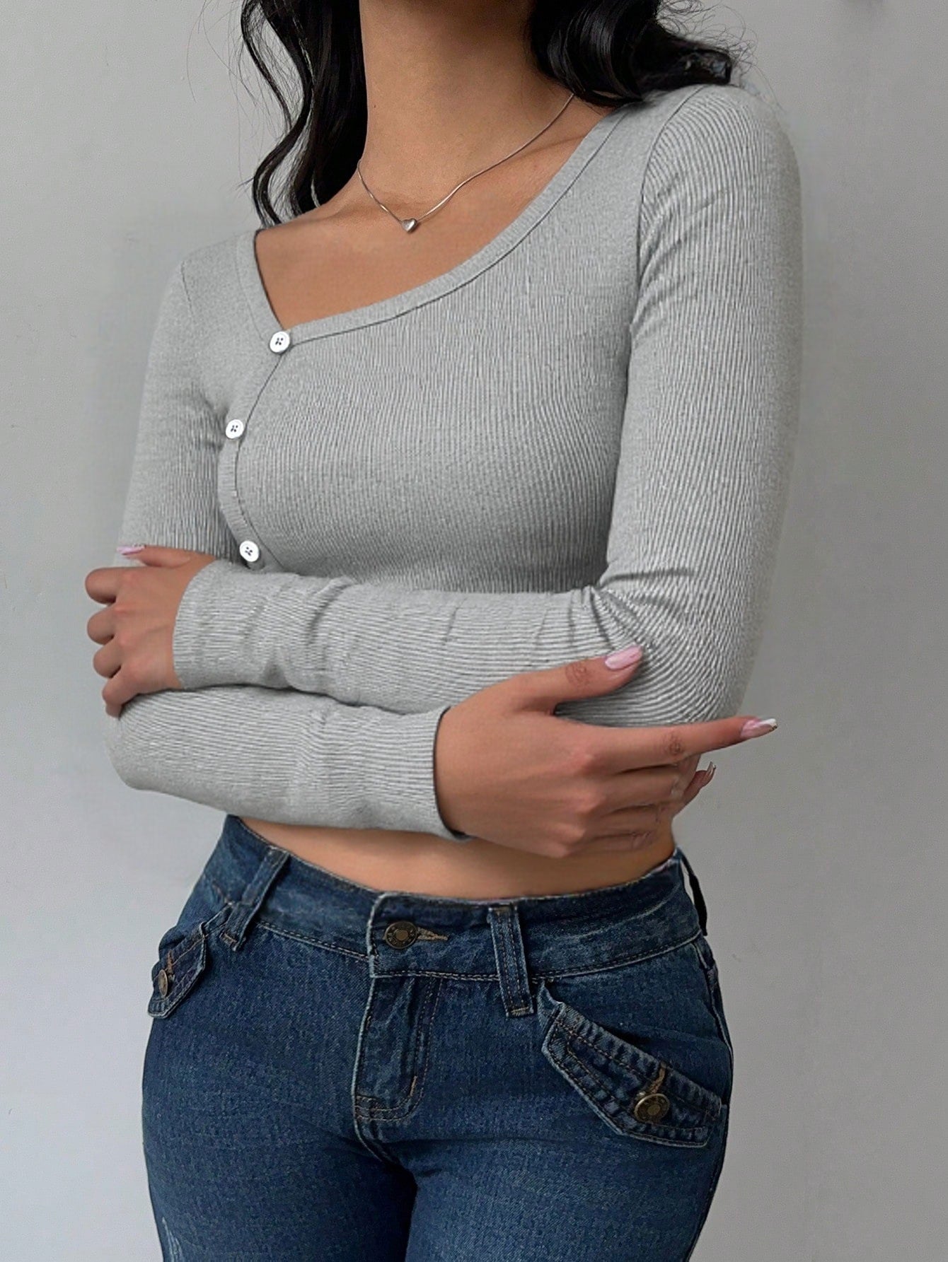 Turn heads with the Asymmetrical Button Crop Top the perfect blend of minimalism and edge. Crafted with soft, ribbed knit fabric that hugs your figure, this long-sleeve top features a unique diagonal button-up detail that instantly elevates your everyday look. Whether you're layering it under a jacket or styling it solo with high-waisted jeans, it’s your new go-to for casual-chic vibes.