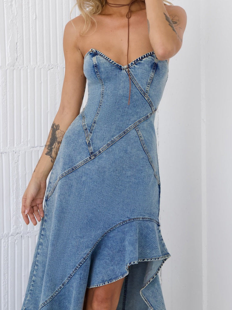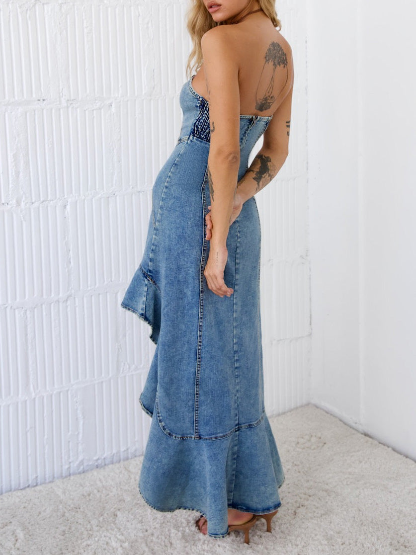 Introducing the Strapless Corset Fishtail Dress where edgy meets sexy. This isn’t just another denim dress it’s your next showstopper.