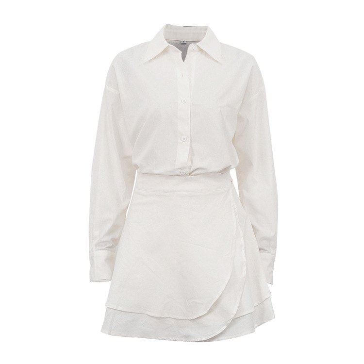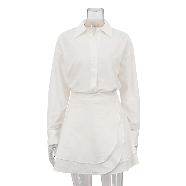 The collared long sleeve shirt brings a crisp, tailored vibe, while the double-layer A-line skirt adds movement and flair, tied together with a flirty lace-up detail that flatters every figure.