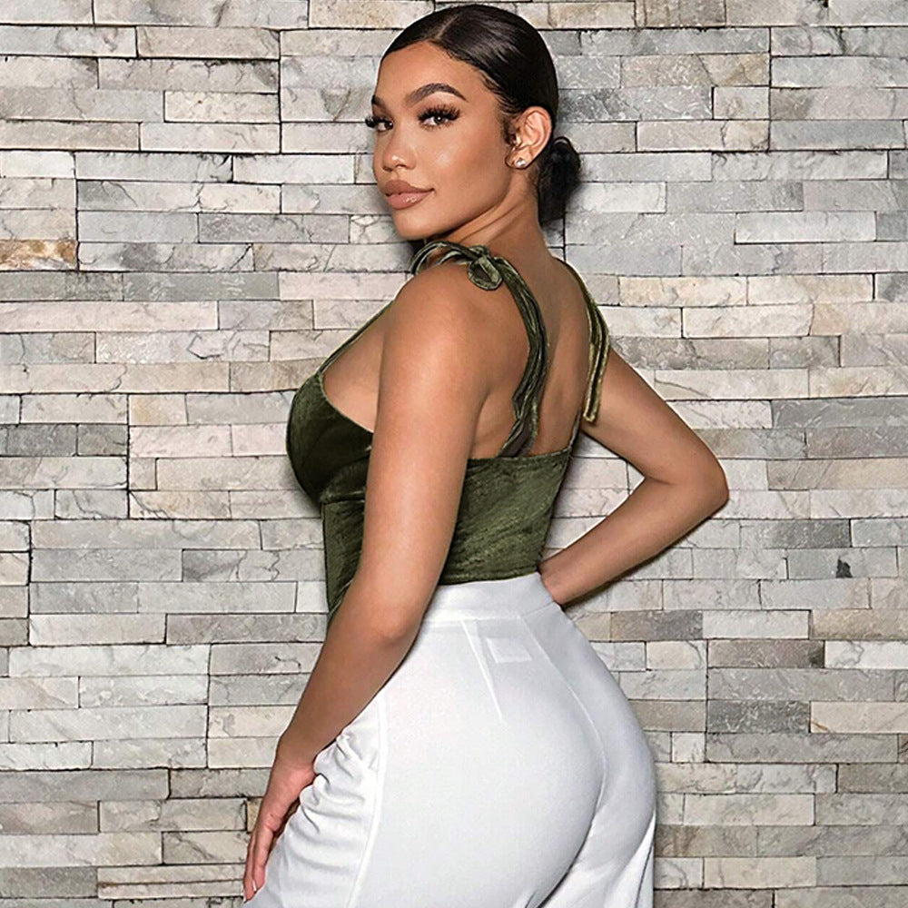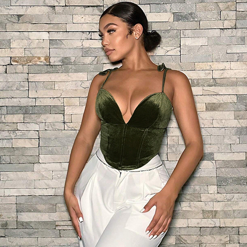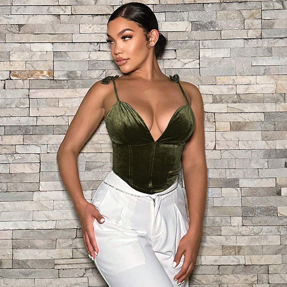 Women’s Velvet Spaghetti Strap Bodysuit | Deep VNeck Slim Fit Top, Olive Green | noémi
