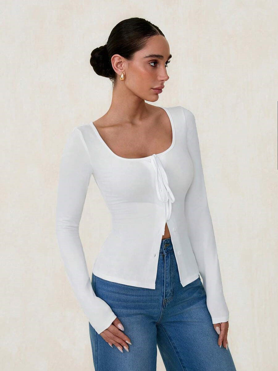 Your new favorite layer is here. Meet the slim-fit cardigan that’s turning heads crafted in a soft stretch fabric with a flattering scoop neckline, eye-catching lace-up front, and delicate button details. Whether you're styling it for brunch, a night out, or layering it for that perfect cozy but chic look, this top effortlessly upgrades any outfit.