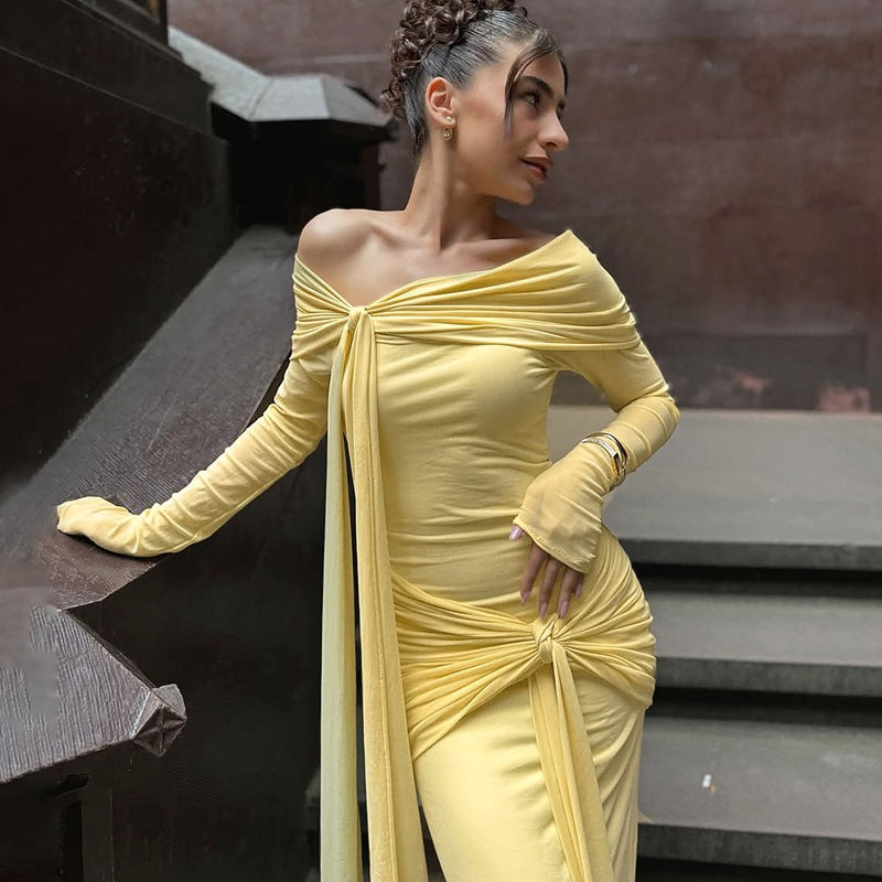Turn heads this summer with our off-shoulder slim fit dress featuring delicate lace-up detailing and sheer panels for a fresh, modern look. Designed to flatter your silhouette while keeping you cool, this dress combines breathable fabric with a stylish cut perfect for daytime outings or evening events. Its versatile design makes it a must-have staple for your warm-weather wardrobe.