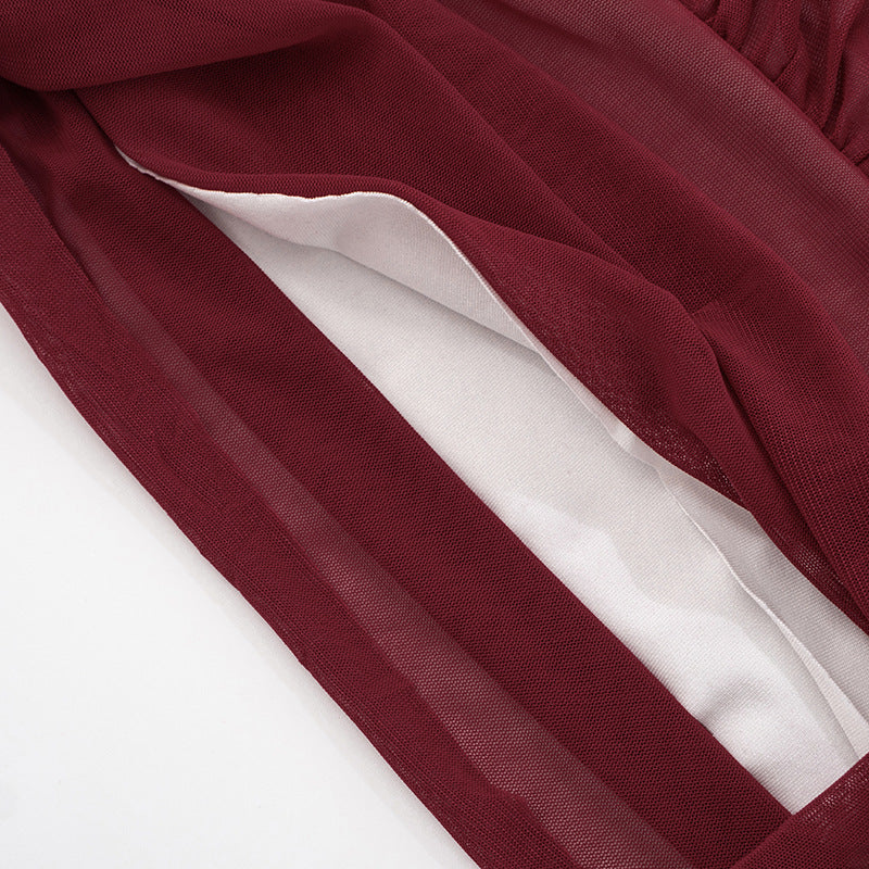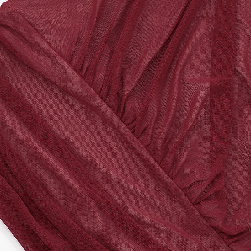 This stunner features a sheer mesh overlay with soft pleating, a bold asymmetrical neckline, and a cinched waist that hugs your curves just right.
