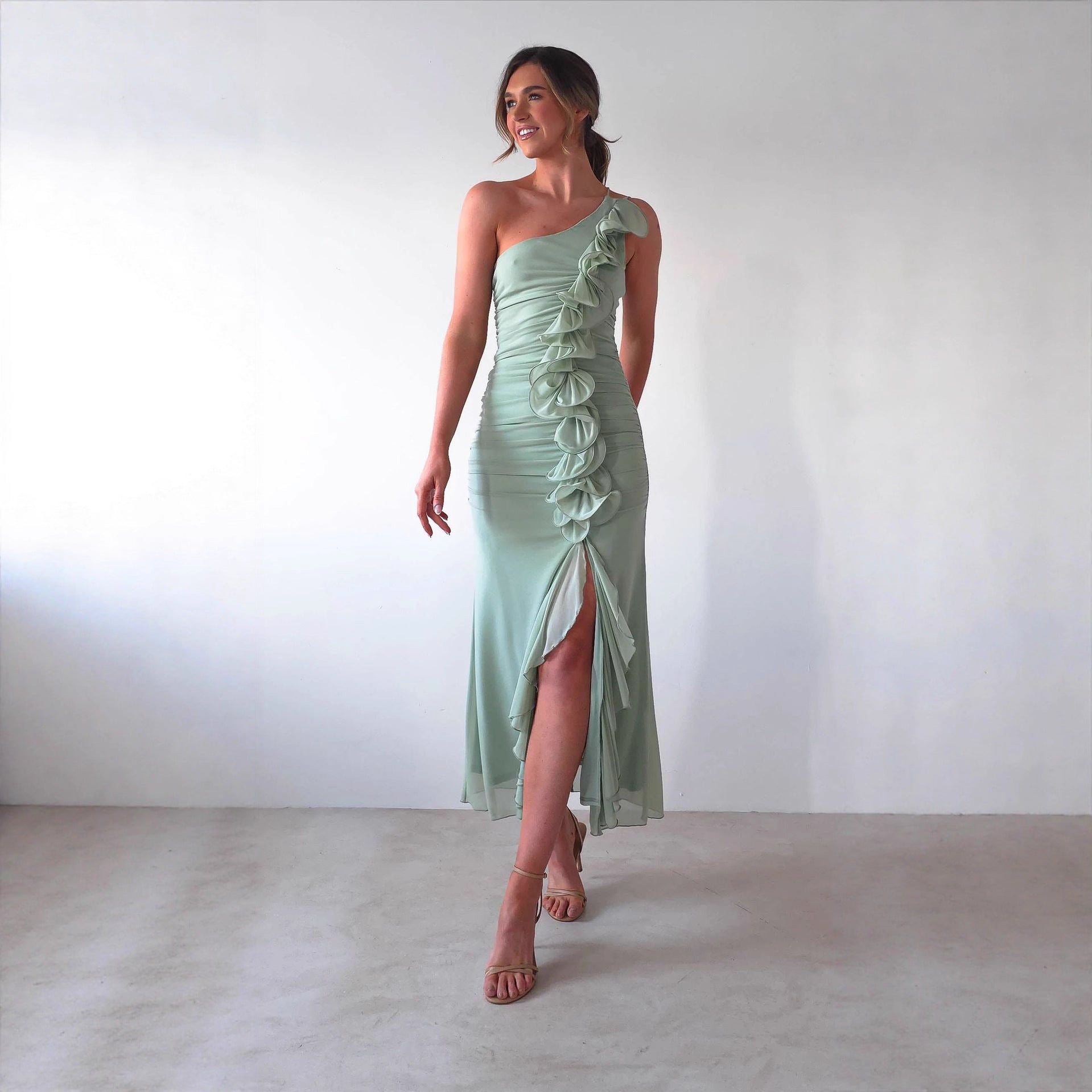 This head-turning piece features a chic one-shoulder neckline, dramatic side slit, and artful ruching that sculpts your silhouette beautifully.